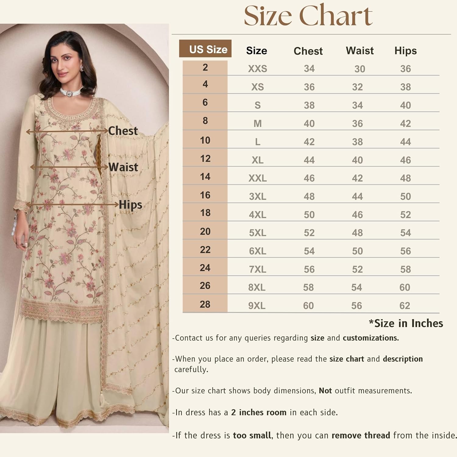 - Size Chart Guide : The measurements in above Size Chart are considered as body measurements. The Ready Garment Size at Bust for all the above sizes in inches will be as following, (XXS-34)(XS-36)(S-38)(M-40)( L-42)( XL-44)(XL-46)(XXL-48)(3XL-50)(4XL-52)(5XL-54)(6XL-56)(7XL-58) || Please follow the size chart ||