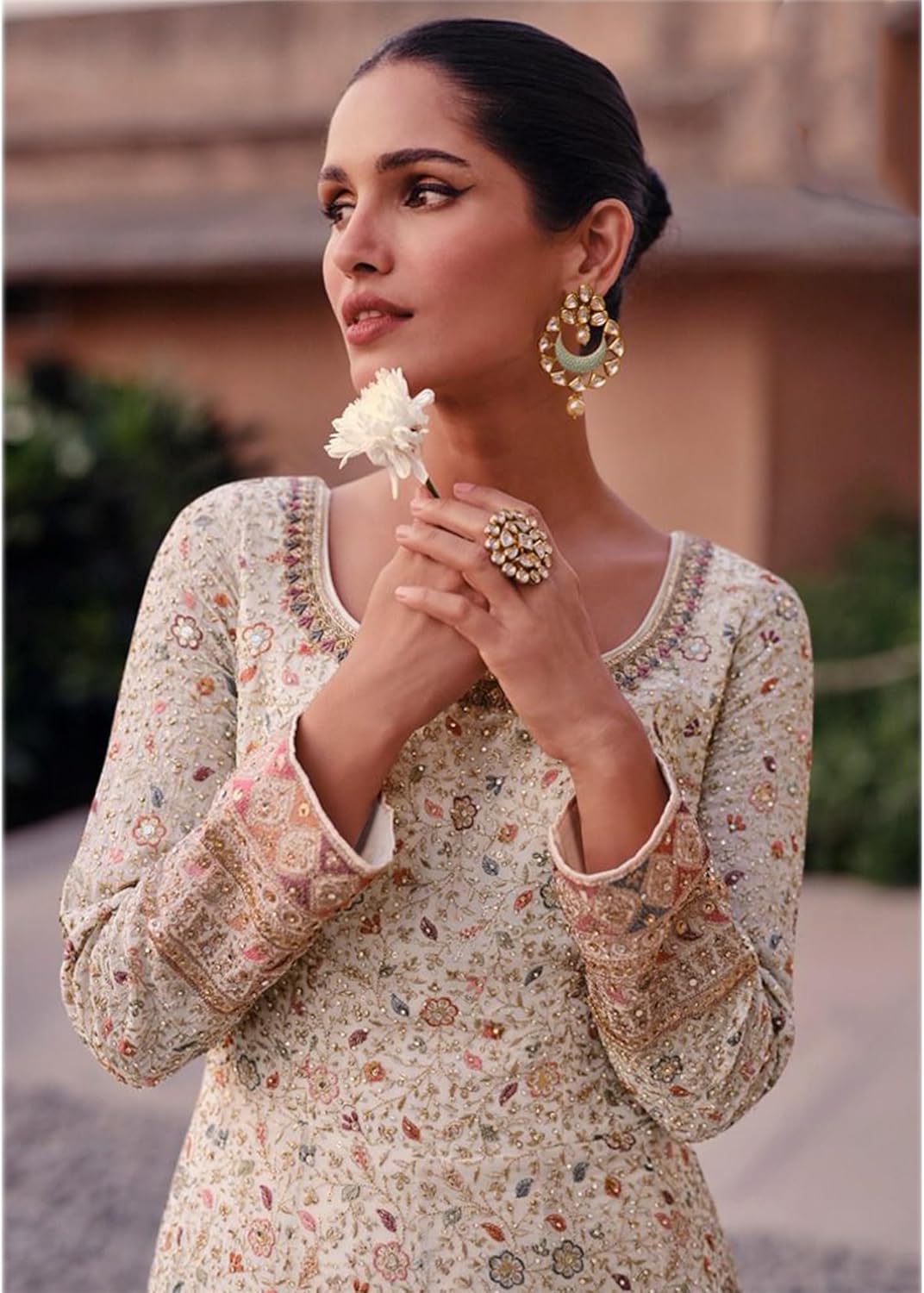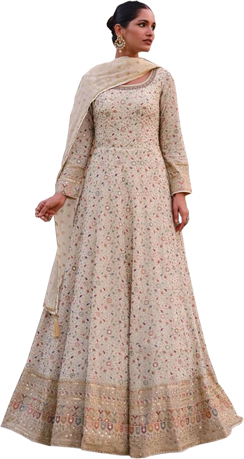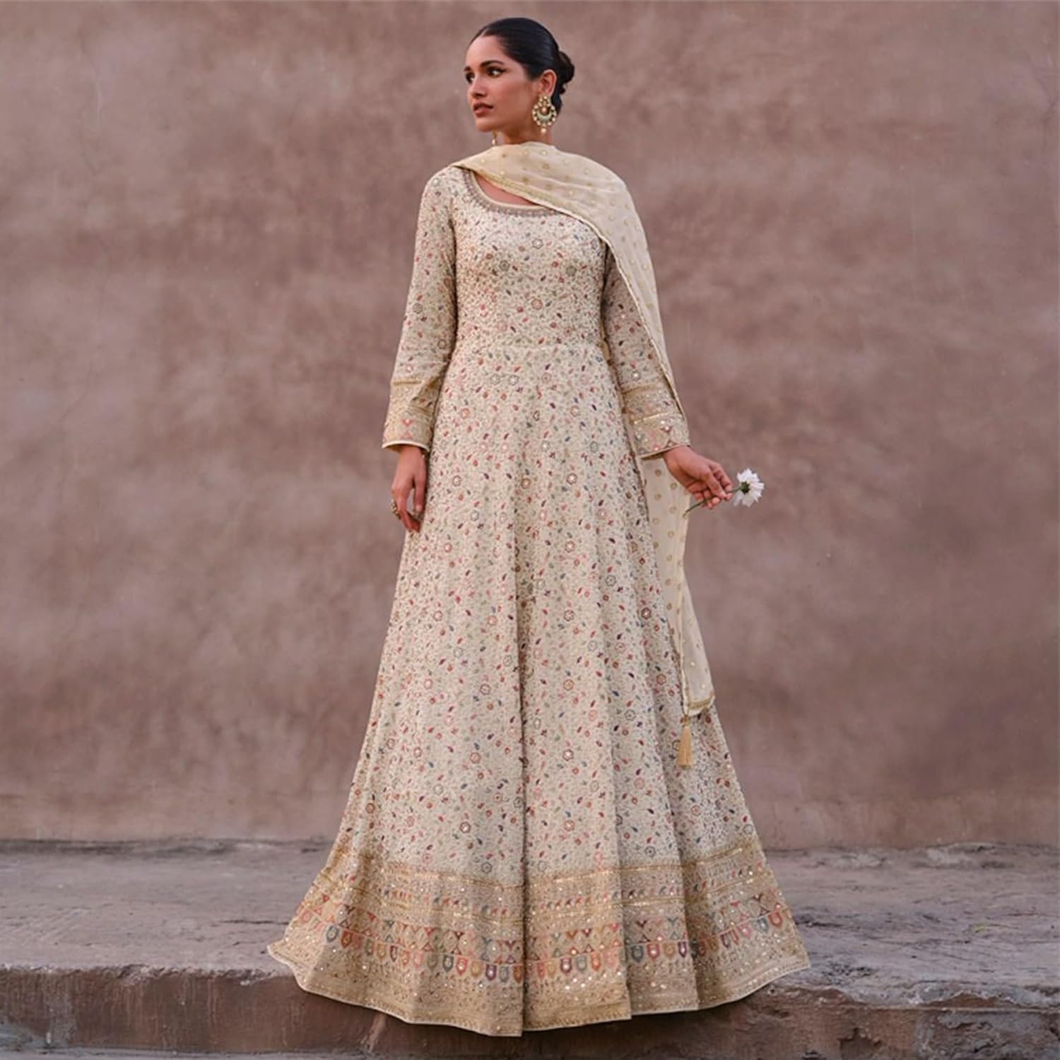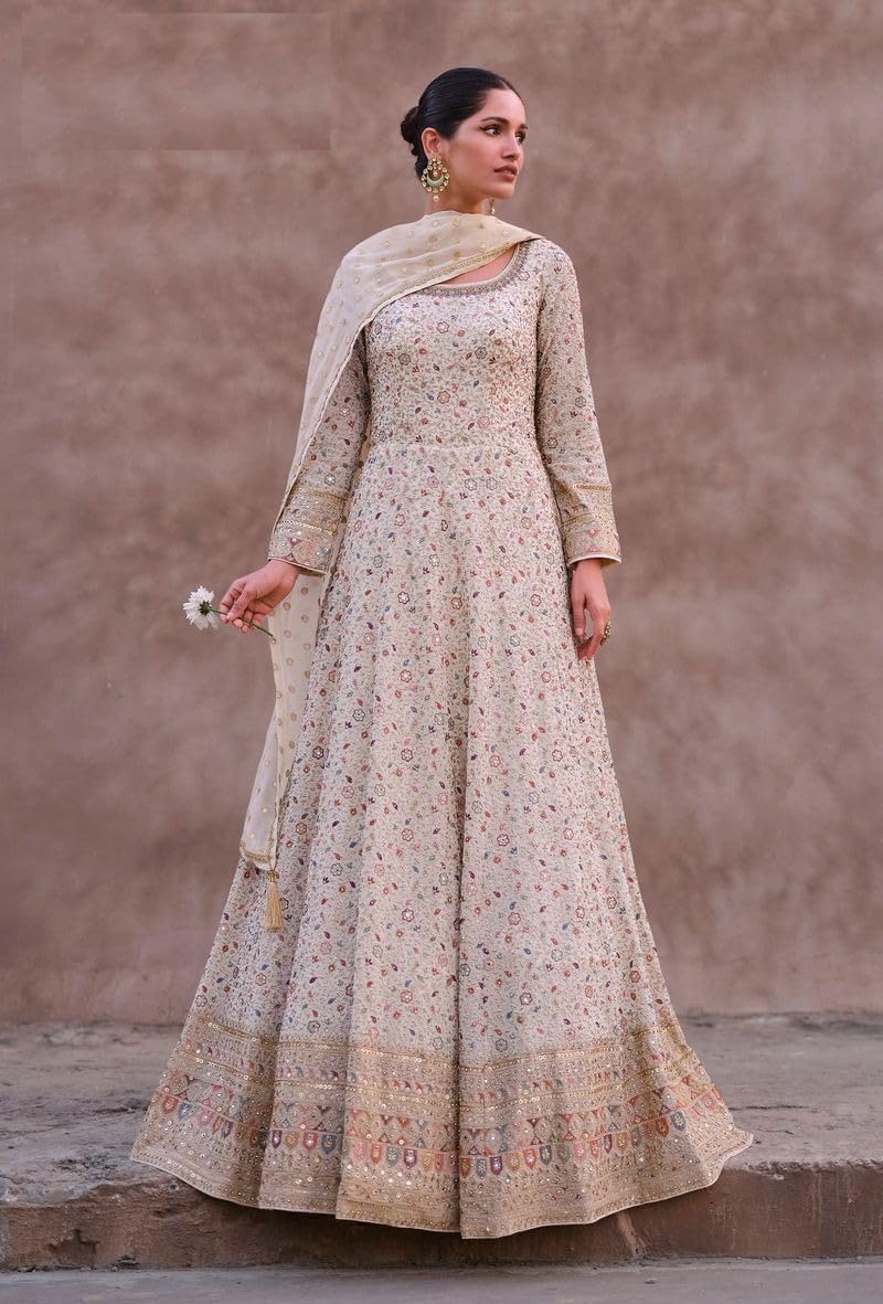 - Fabric Description :- Top :Real Georgette || Sleeves :- Long Sleeve || Bottom :-Real Georgette || Dupatta :-Real Georgette || Size :- Max up to 42″ Inches || Work :-Embroidery Work || Style :-Anarkali Gown Suits || Type :- Ready to Wear ||