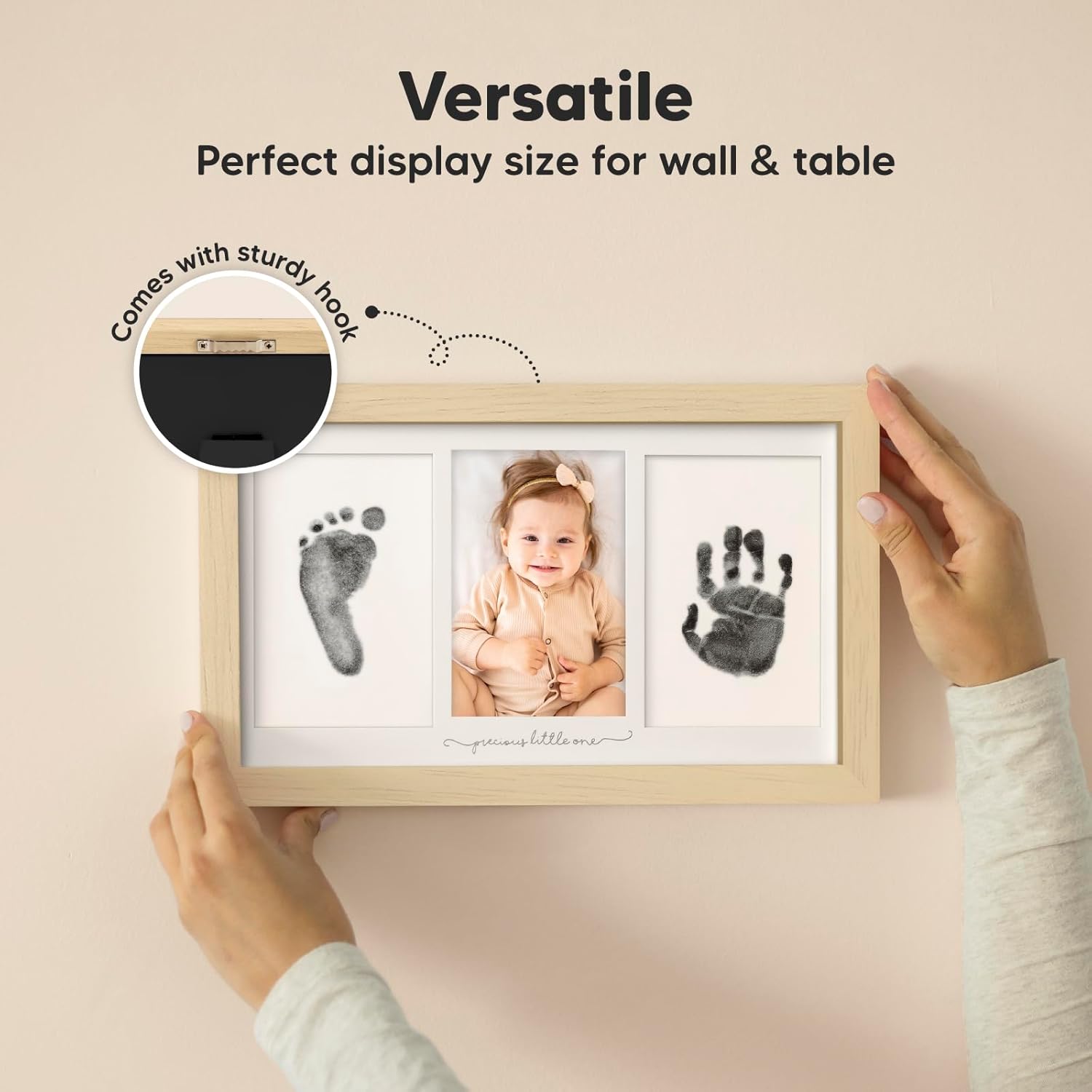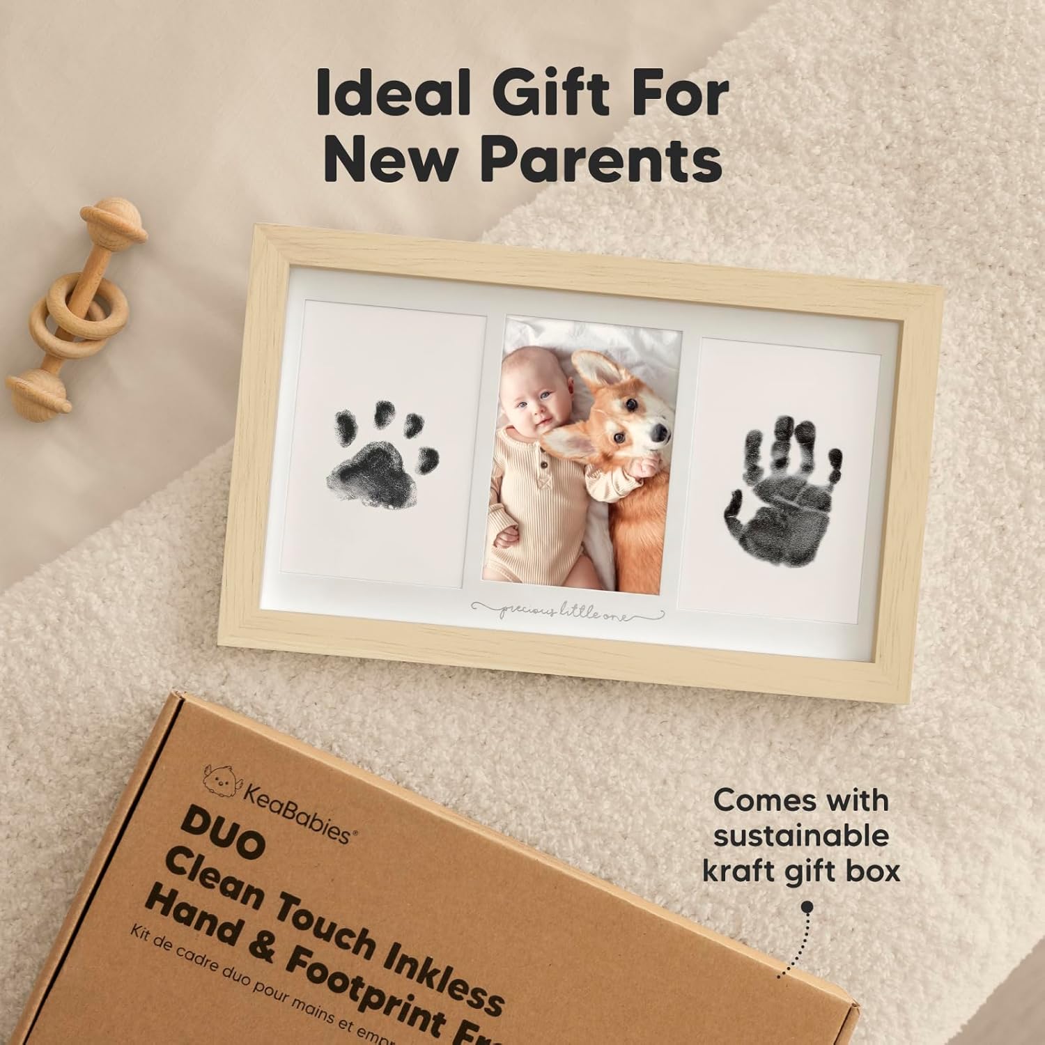 What’s Inside 13″ by 7.8″ wooden frame with durable glass cover, three frame cut-outs, clean touch inkless ink pad, four 250gsm art cards, double-sided tape Ink Pad Mess-free clean touch inkless ink pad Imprint Size Suitable for newborns, babies, toddlers, infants 0 to 18 months old, dog paws, and cat paws Special Instructions Read the manufacturer’s instructions carefully before you begin crafting. Look out for the ‘stop’ label on the ink pad to prevent imprinting on the wrong surface. Suitable For Newborns, Babies, Infants, Toddlers, Pets, Dogs, Cats Gender Unisex, baby boys, baby girls Gift-Ready Beautifully packaged in kraft gift box Best Uses Baby handprints, baby footprints, pet paw prints, dog paw prints, cat paw prints, baby hand and footprints kit, baby keepsake kit Gifts Occasions Baby gifts, baby shower gift, gender reveal gifts, baby announcements, baby registry gifts, new parents gifts, grandma gifts, Mother’s Day gifts, Father’s Day gifts, grandparents gifts, Christmas gifts, Thanksgiving gifts, new baby gift