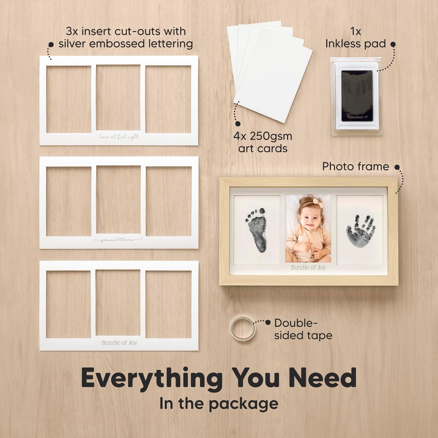 A thoughtful baby gift goes a long way. This all-inclusive craft kit comes with everything, including clean touch inkless ink pad, frame cutouts, and a kraft gift box—no additional purchase required.
