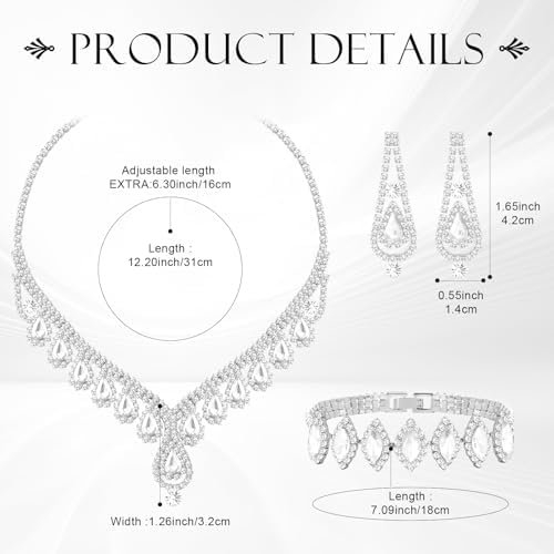 - WEDDING JEWELRY – This silver necklace and earring set designed for bride and bridesmaids. Necklace Length : 31cm+5cm extra extension buckle. Dangle Earrings Size : 1.4cm * 4.2cm. Bracelet Length : Adjustable in 19cm. It can perfectly match your wedding dress and bridesmaid dress, makes you looks more elegant and exquisite, charming in the crowd.