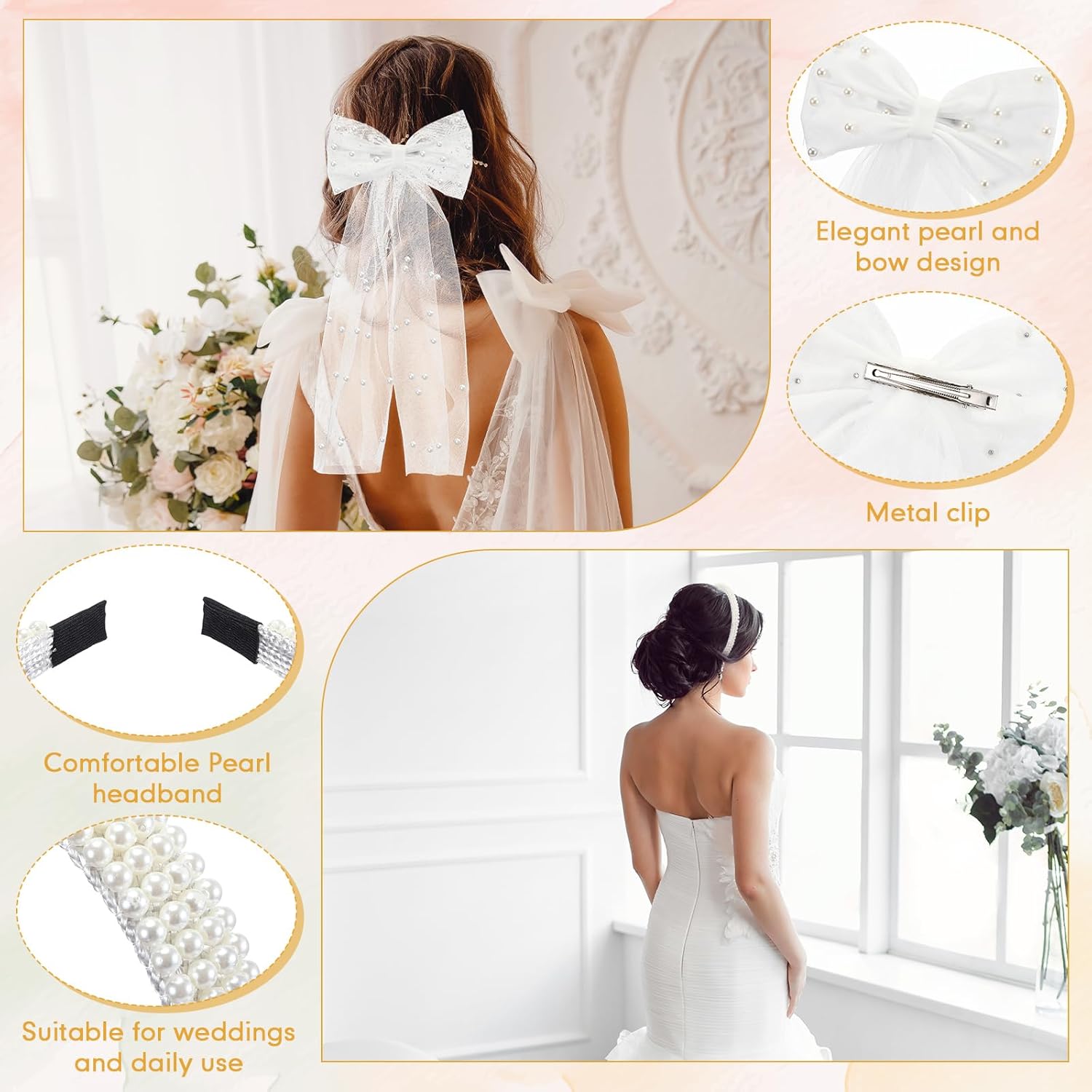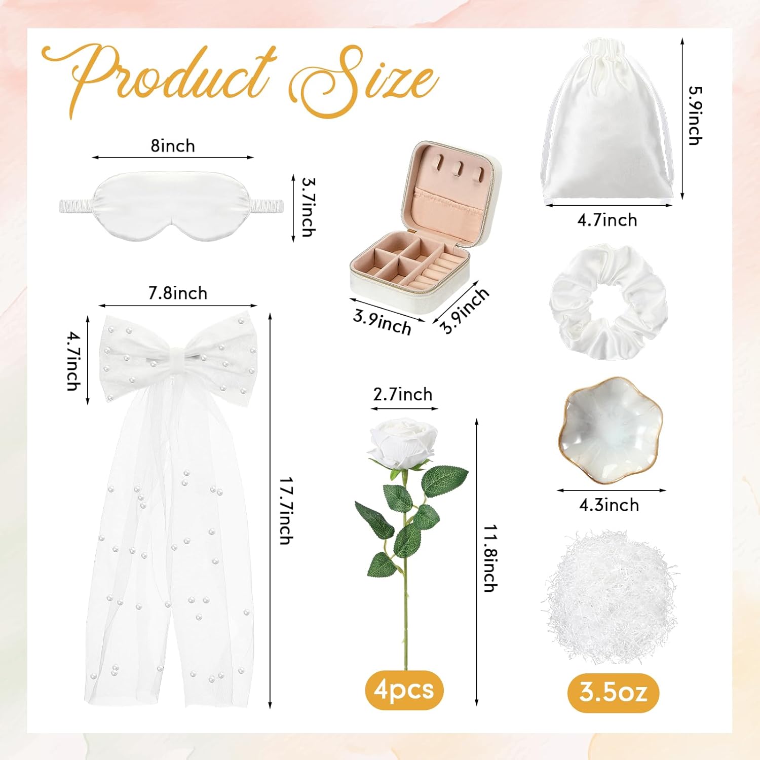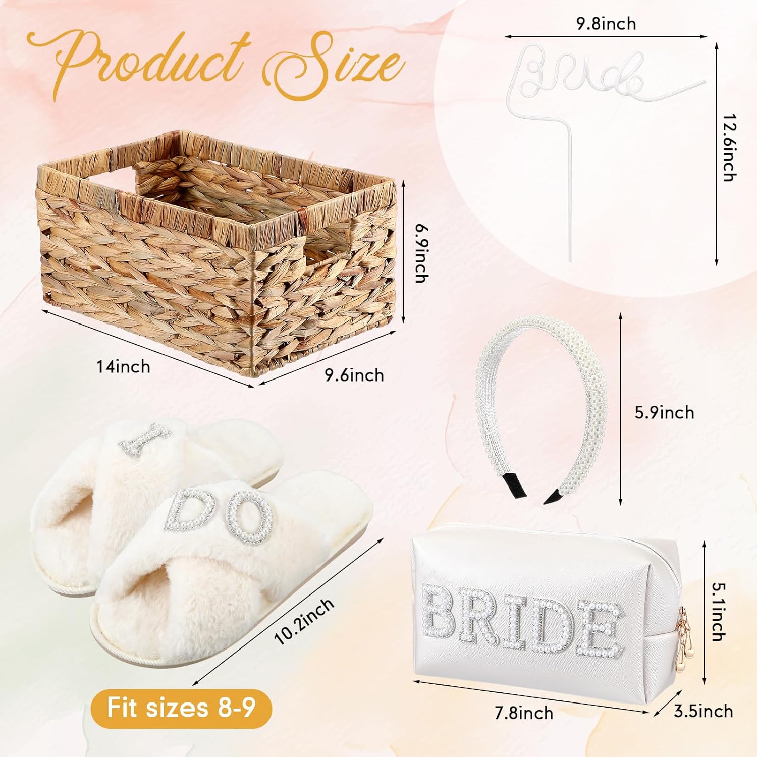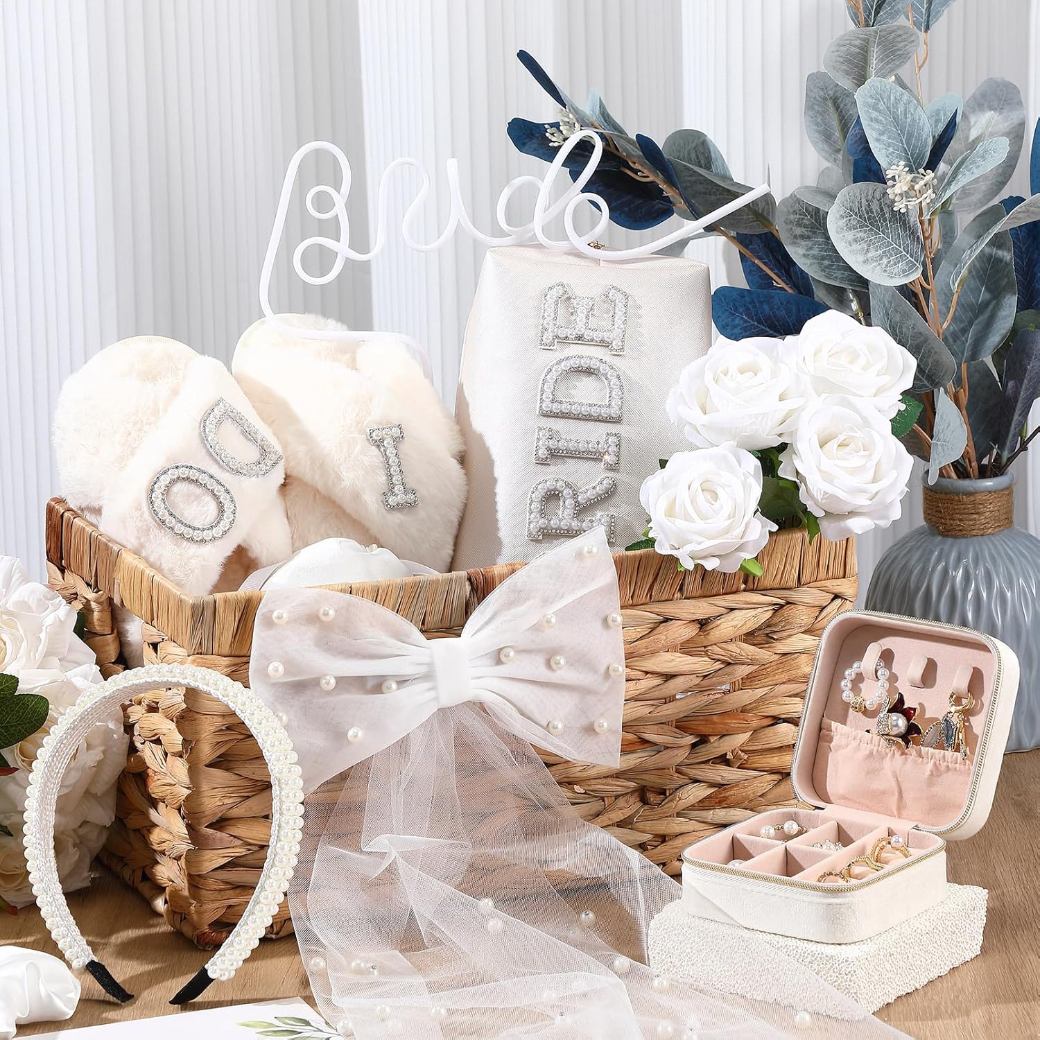 - Ideal Bride to Be Gift Set: the package is brimming with a wide range of bridal goodies; Included are 1 gift basket, 1 pair of soft bride slippers, 1 make up bag, 1 jewelry box, 1 elegant pearl headband, 1 stunning pearl veil, 4 realistic fake roses, 1 jewelry tray, 1 pack of artificial grass, 1 straw, and a set of sleep mask ensuring all essentials are covered