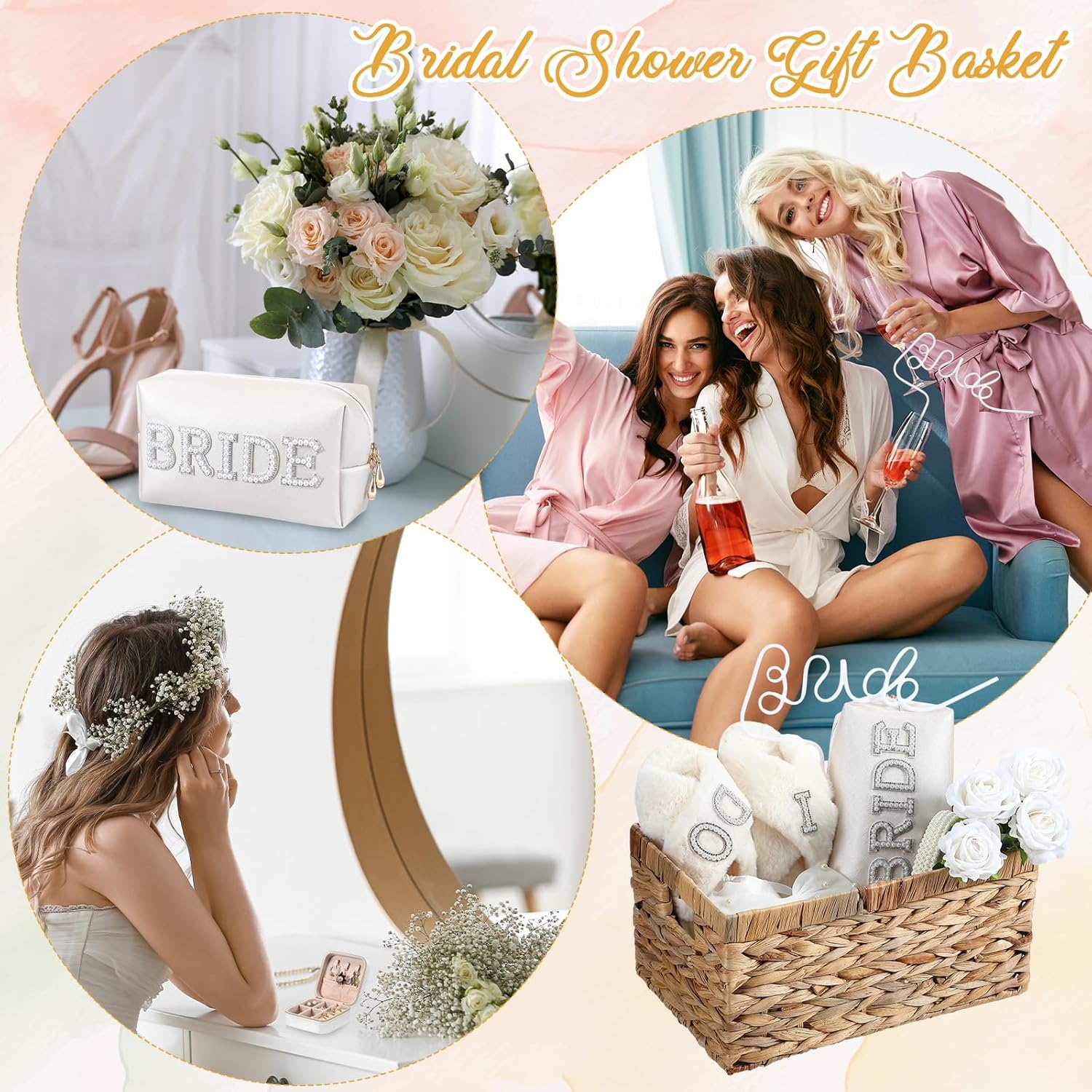 - Finely Crafted Material: the bridal shower gifts basket set brings you an all roundly exquisite collection of bridal items; The gift basket is elegantly crafted from water asparagus; The cuddly slippers are made of fluffy fabric and TPR, offering optimal comfort; Meanwhile, the make up bag boasts PU leather, lending a touch of luxury