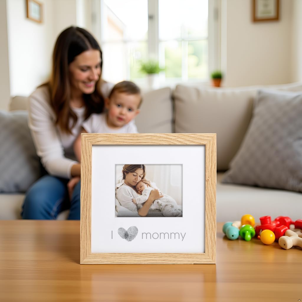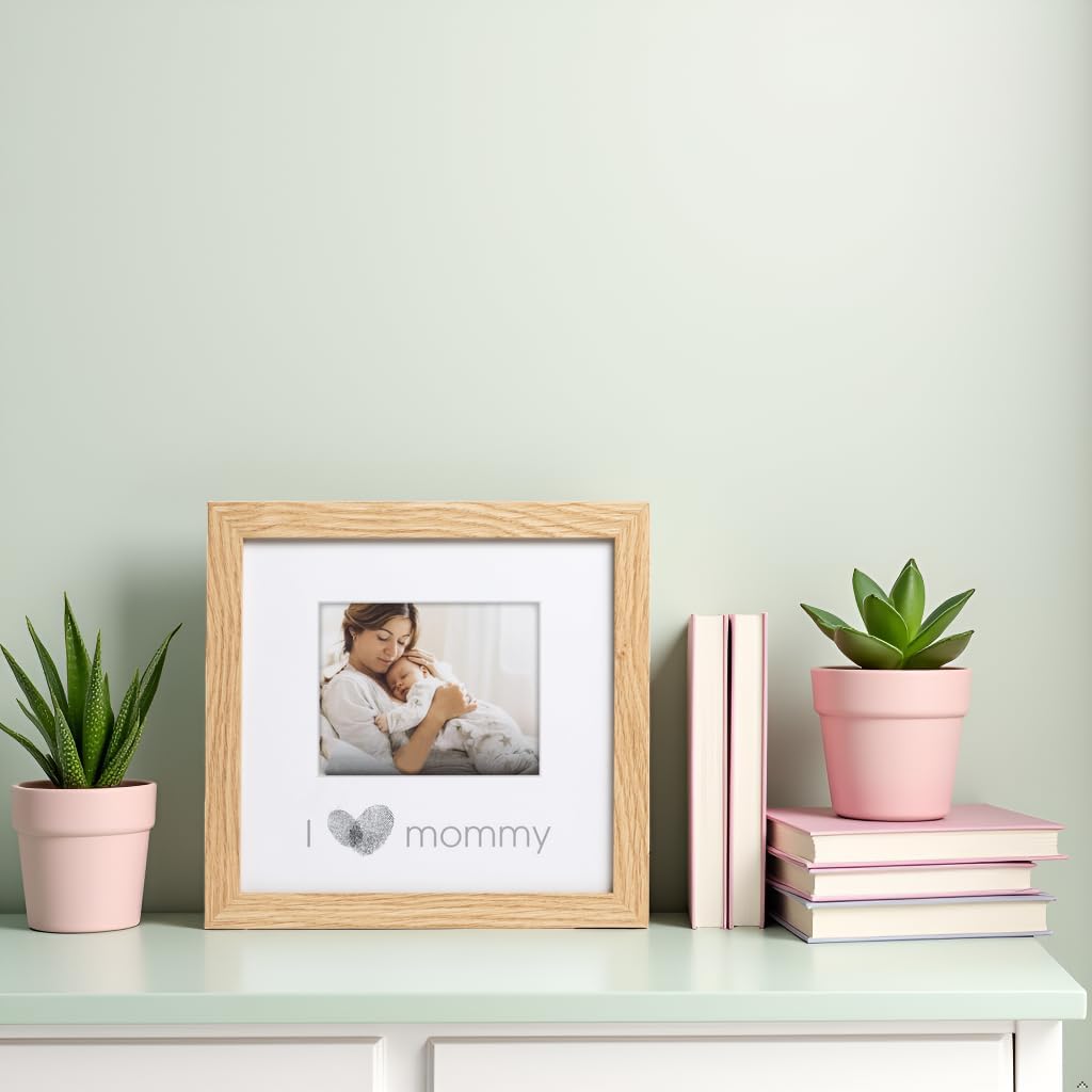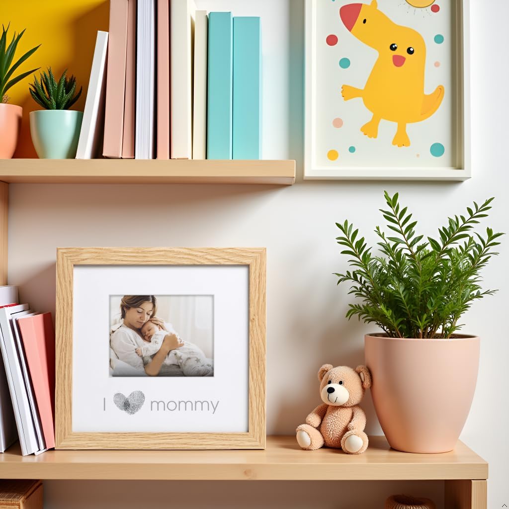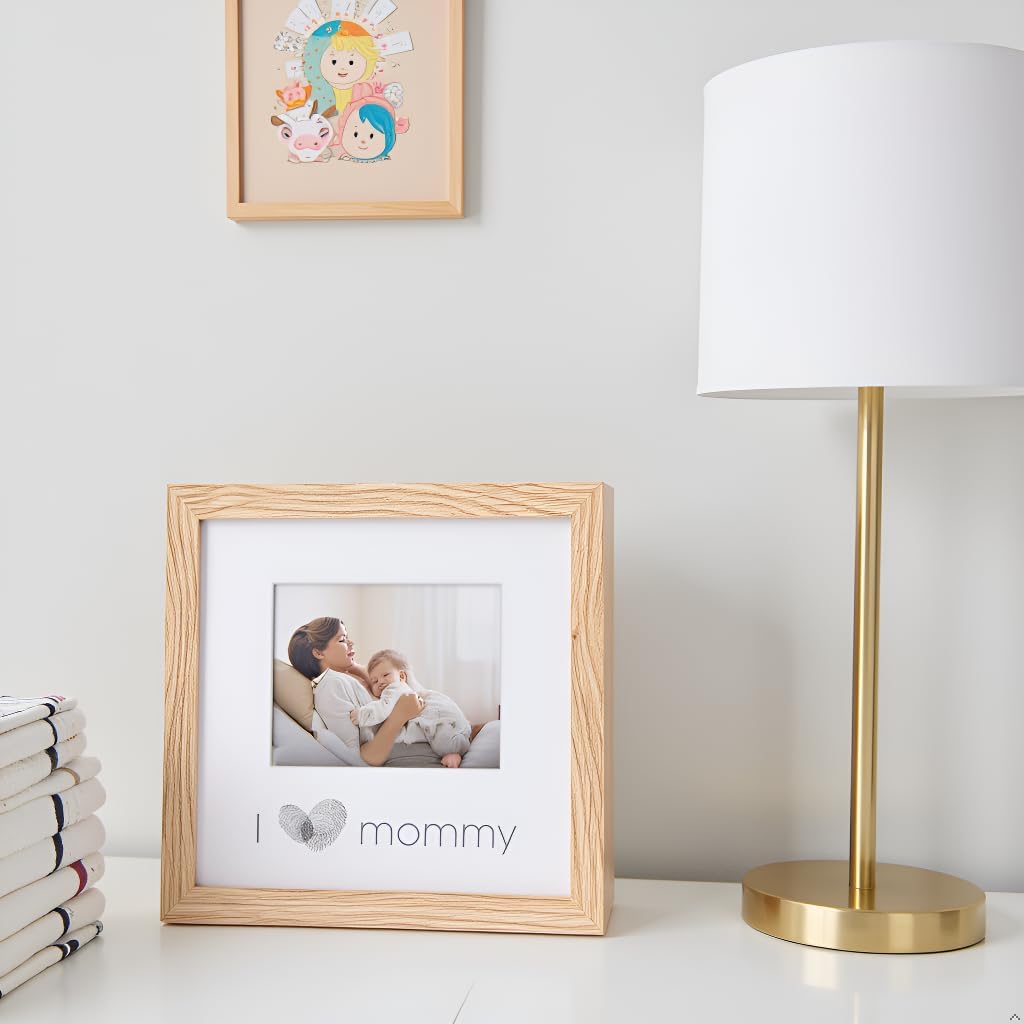 Capture the joy of motherhood with this charming “I Love Mommy” thumbprint frame. The soft natural wood and clean white matting create a timeless display for your baby’s first photo, making it a heartwarming keepsake that fits beautifully in any space.