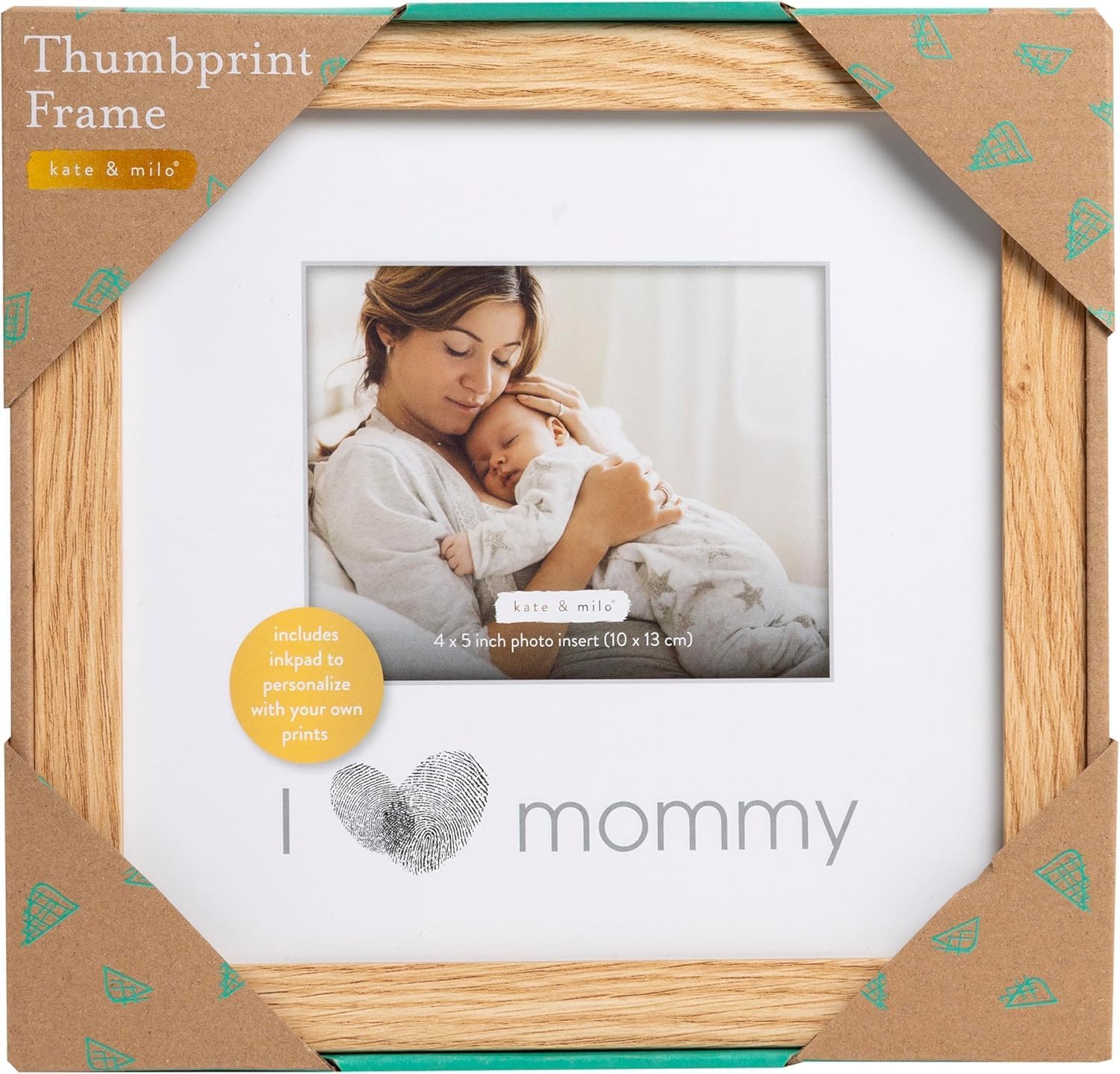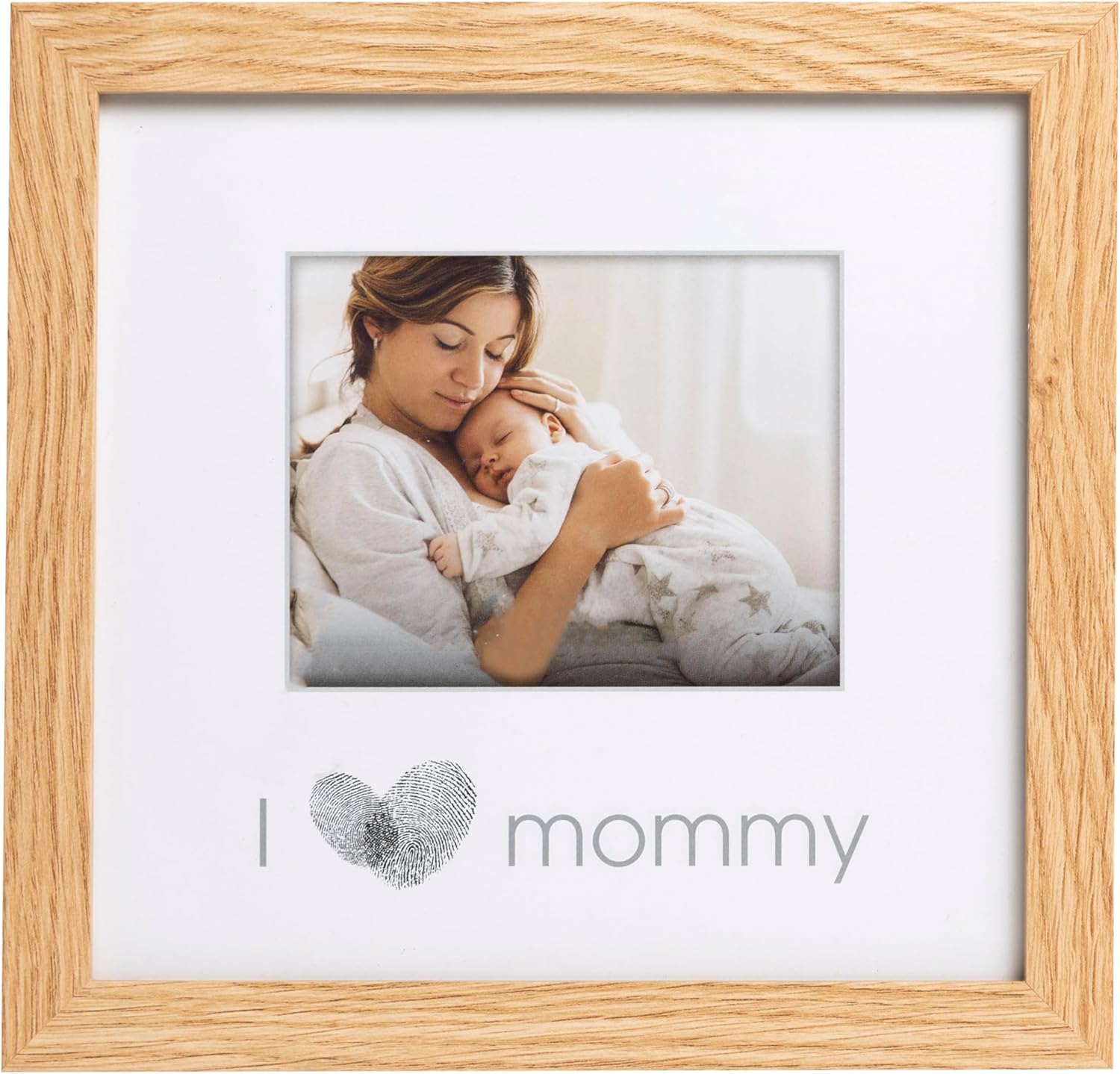 features Includes a natural wood frame that reads “i love mommy” on white acid-free beveled mat Also includes one photo insert, 1 ink pad, tan accent mat, easel, wall hanger, and instructions Photo insert: 4” x 5” Frame dimensions: 9.1” W x 8.74” H x .5” D