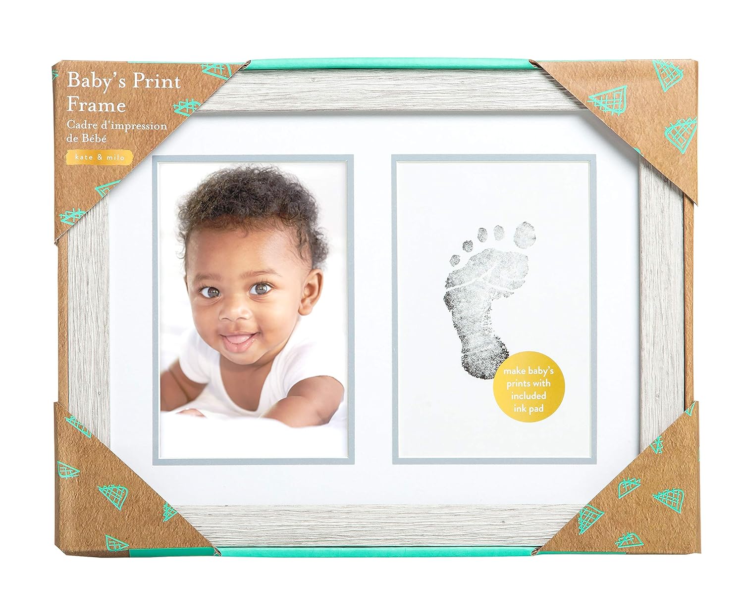 Capture and cherish your little ones prints forever with this Kate & Milo babyprint classic wooden photo frame. This classic white and wood baby frame has will display your little ones cute photo next to their tiny and adorable newborn handprint and footprint. This frame includes everything you need to make this precious baby keepsake including an easy-to-use ink pad. This timeless and trendy baby keepsake frame will effortlessly match any home dcor making it the perfect gender-neutral nursery dcor accessory, baby girl nursery dcor accessory or baby boy nursery dcor accessory. The whole family will love looking back on babys tiny prints as they grow older and taller each month. This classic baby frame makes the perfect gender-neutral baby gift, baby boy gift, baby girl gift, pregnancy gift, expecting mother gift, soon to be mom gift, expecting parent gift or addition to your own baby shower gift registry! Kate & Milo offers a variety of products perfect for any family expecting, newly engaged, newlyweds, couples, baby’s first holiday, or a baby shower gift; including holiday gifts, tree ornaments, baby frames, wedding frames, wedding gifts, baby keepsakes, wedding keepsakes, engagement gifts, wedding gifts, pregnancy gifts, and baby gifts. Click on Kate & Milo in this listing to see more baby options available! Frame dimensions: 18.5W x 9.5H x 0.5D; Photo insert: 4W x 6H.
