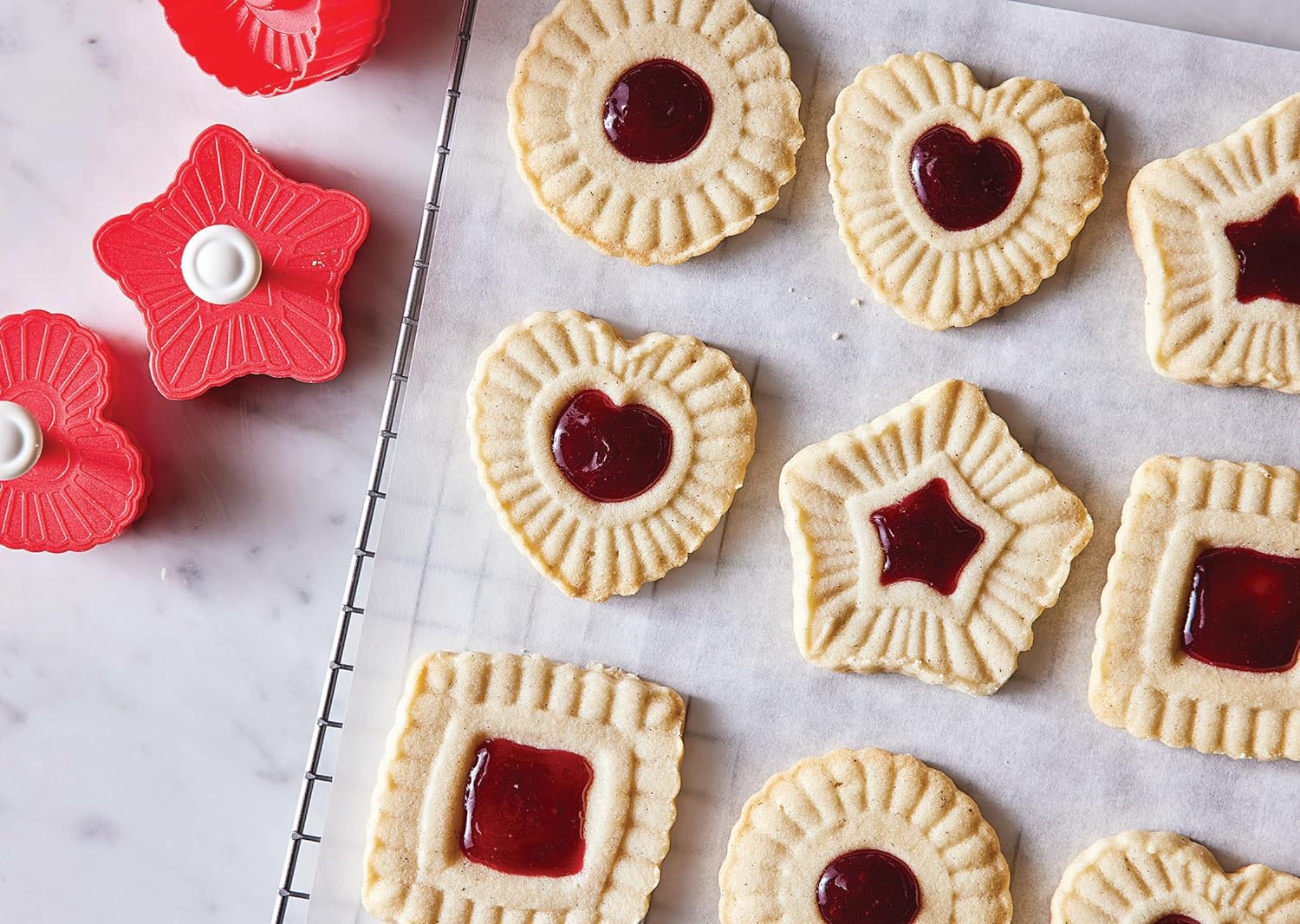 - King Arthur Baking Company’s Thumbprint Pop-Out Cookie Cutters stamps beautifully embossed dough with adorned edges and center thumbprints for filling