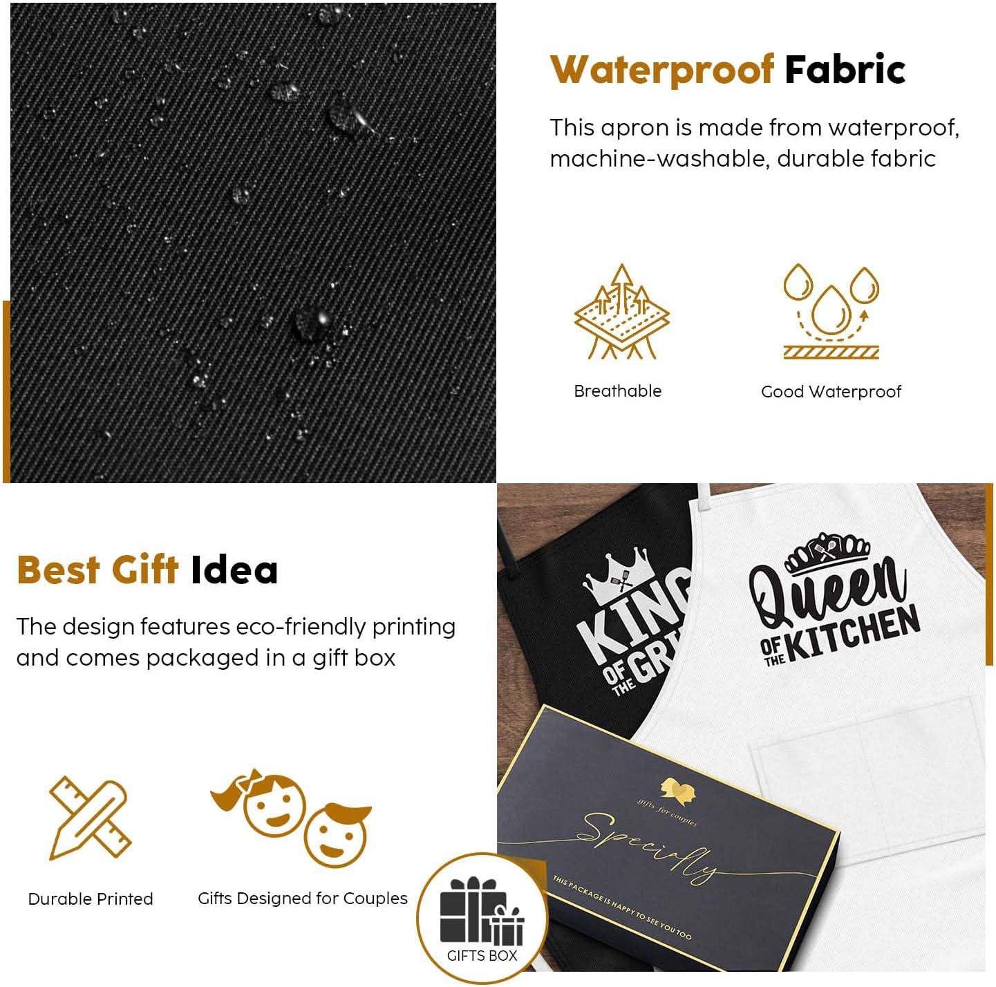 - GIFTS FOR COUPLES WHO HAVE EVERYTHING – KING and QUEEN apron gift set is made of densely-woven polyester fabrics do waterproof and stainproof. It can be worn while doing housework, gardening, painting and baking… Our King and Queen matching aprons come packaged in a beautiful box, ready to be gifted. Want to be the hit of the party? ADD TO CART!
