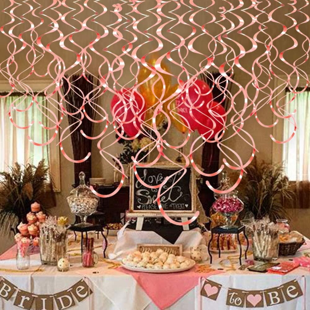 - These rose gold Hanging party supplies really catch the light and make the room festive, great add in for any birthday party graduation party decorations.metallic swirls decorations can be hung from ceiling, window, mantel, overhangs, doorway, archway, branches in trees or used as unique table centerpieces