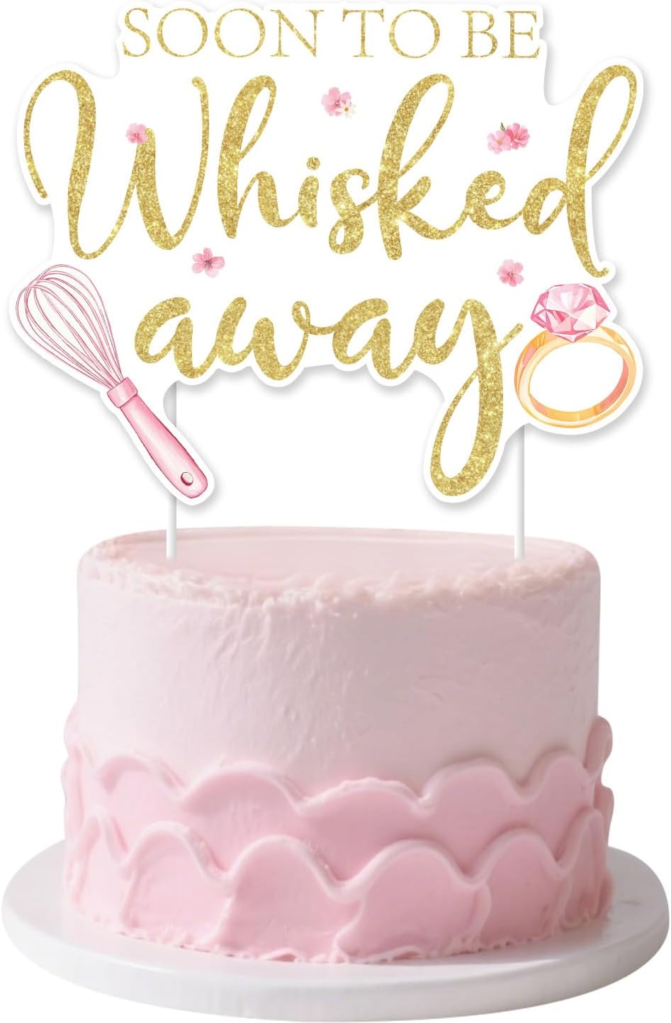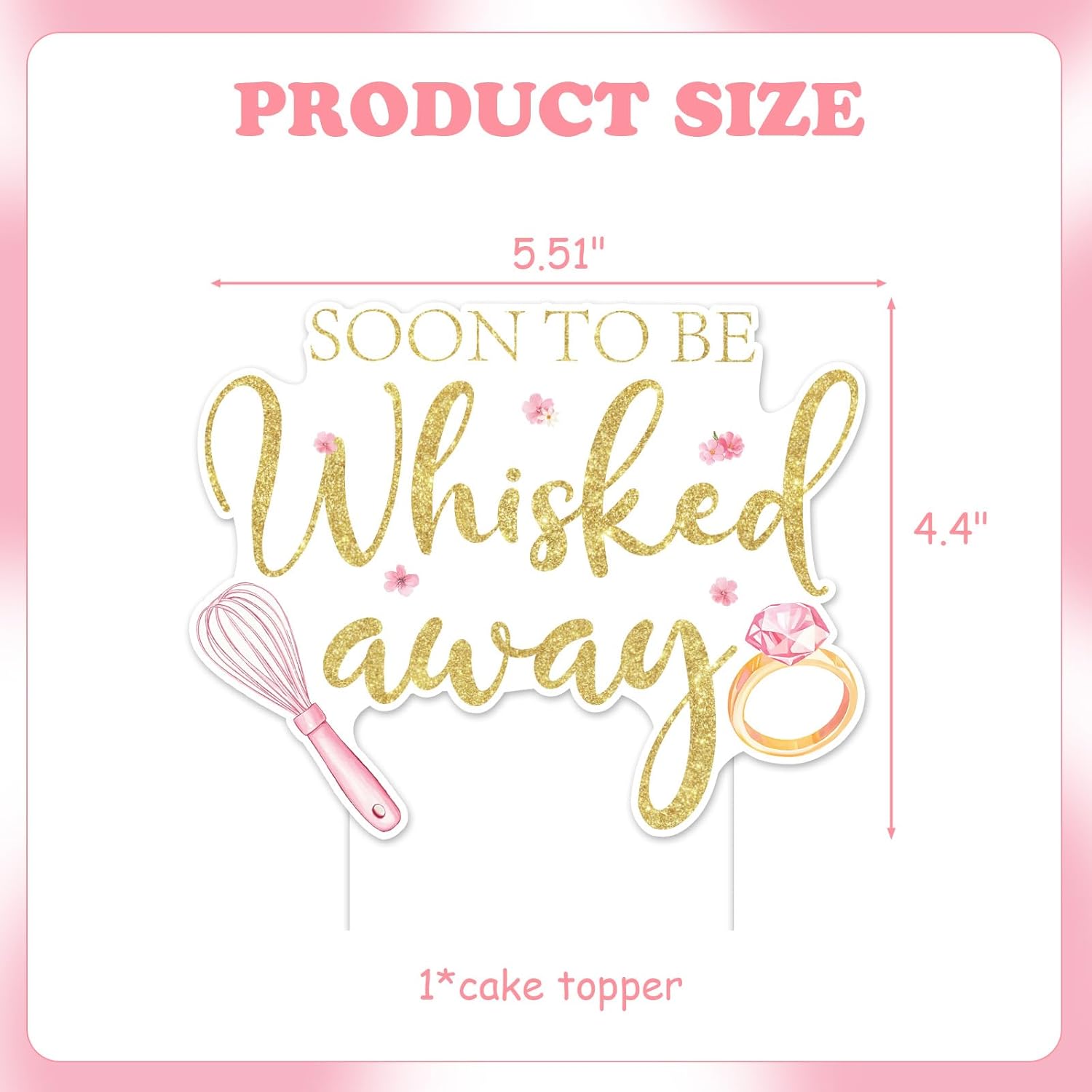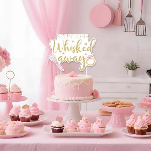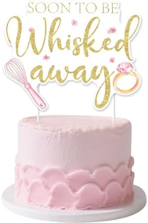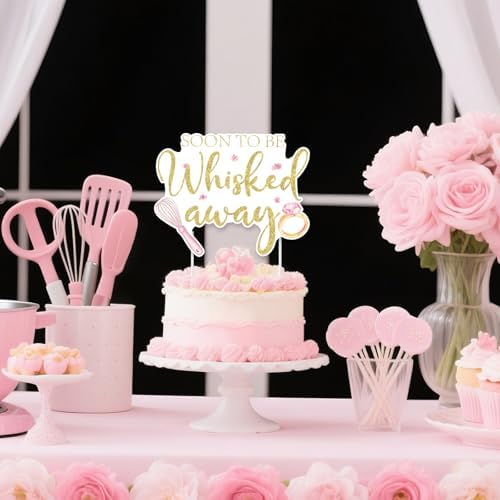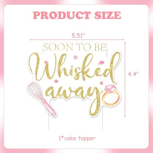 - Stunning Design: This charming cake topper features a whimsical kitchen theme with the playful phrase “soon to be whisked away” in elegant gold glitter text. The whisk-shaped design is adorned with pink flowers and diamond ring , creating a blend of culinary and bridal elements