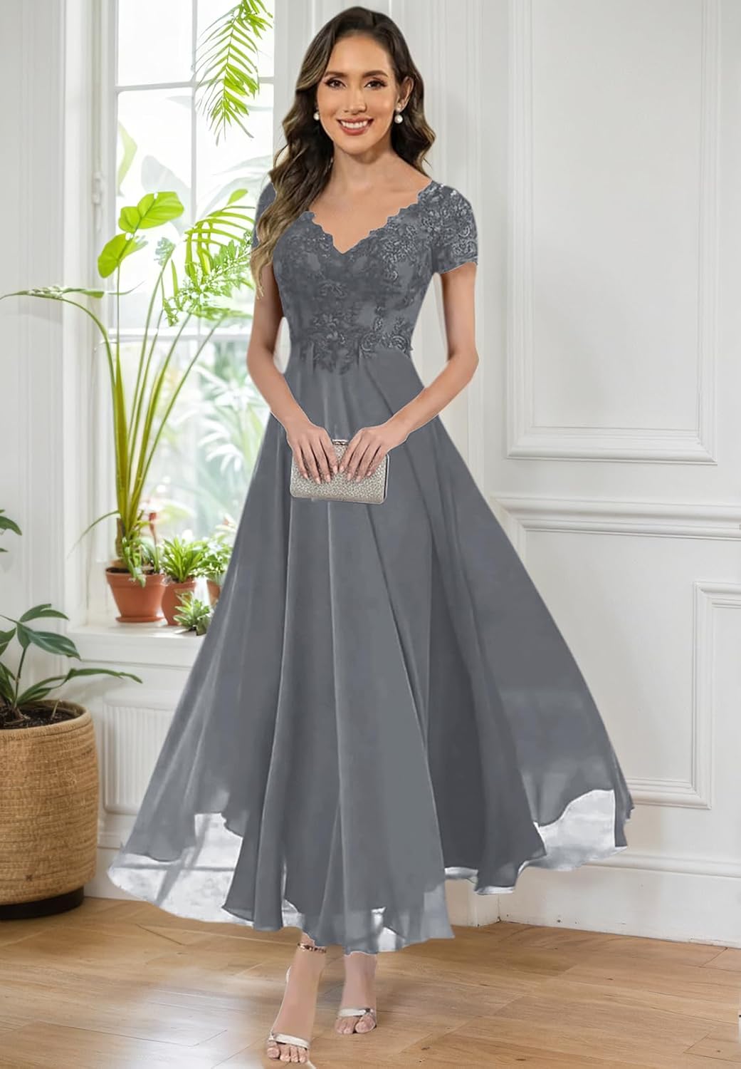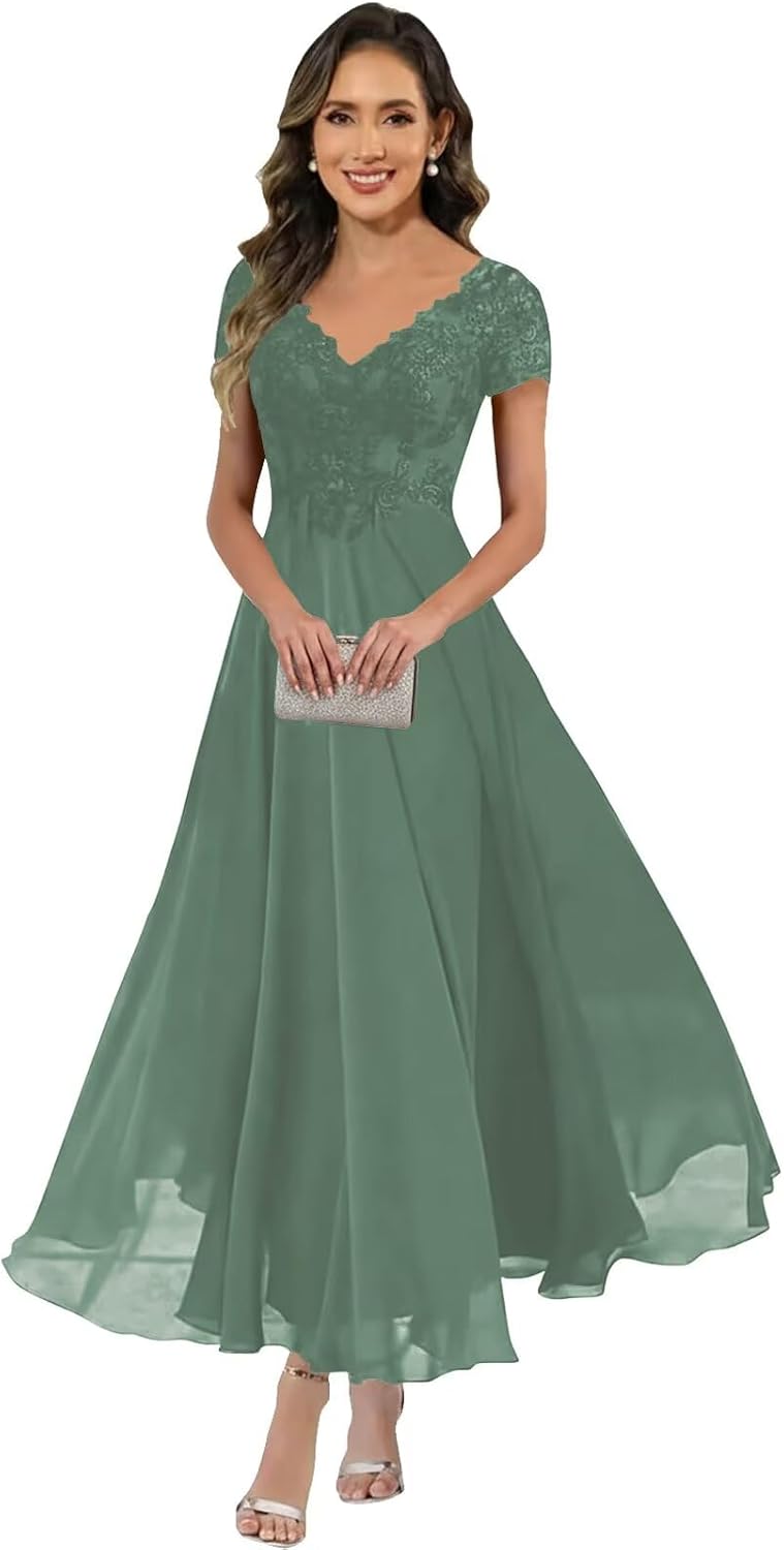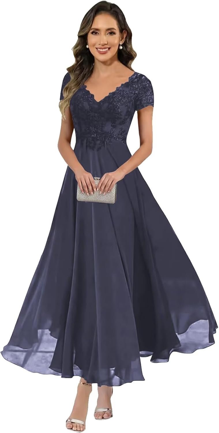 - Feature:tea length wedding dress,floral mother of the bride dresses,tea length mother of the groom dress for wedding,v neck wedding guest dresses with sleeves,a line mother of bride dresses for women,short sleeve long cocktail dress,modest bridesmaid dresses,ankle length formal evening dress,empire waist,lace applique,padded, lined,zipper back.You will receive many compliments on this pretty dress