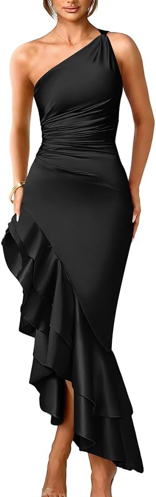 Women’s Sexy One Shoulder Ruched Ruffle Party Long Dress dressdress