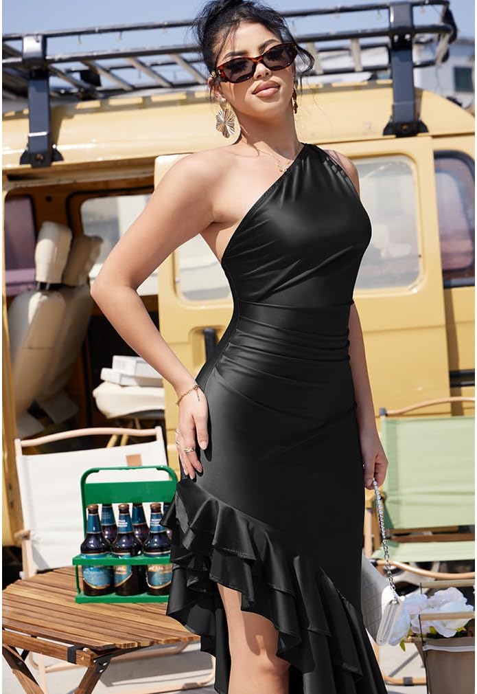 Be the first to review “LAGSHIAN Womens Elegant One Shoulder Ruched Asymmetric Ruffle Satin Cocktail Party Maxi Dress”