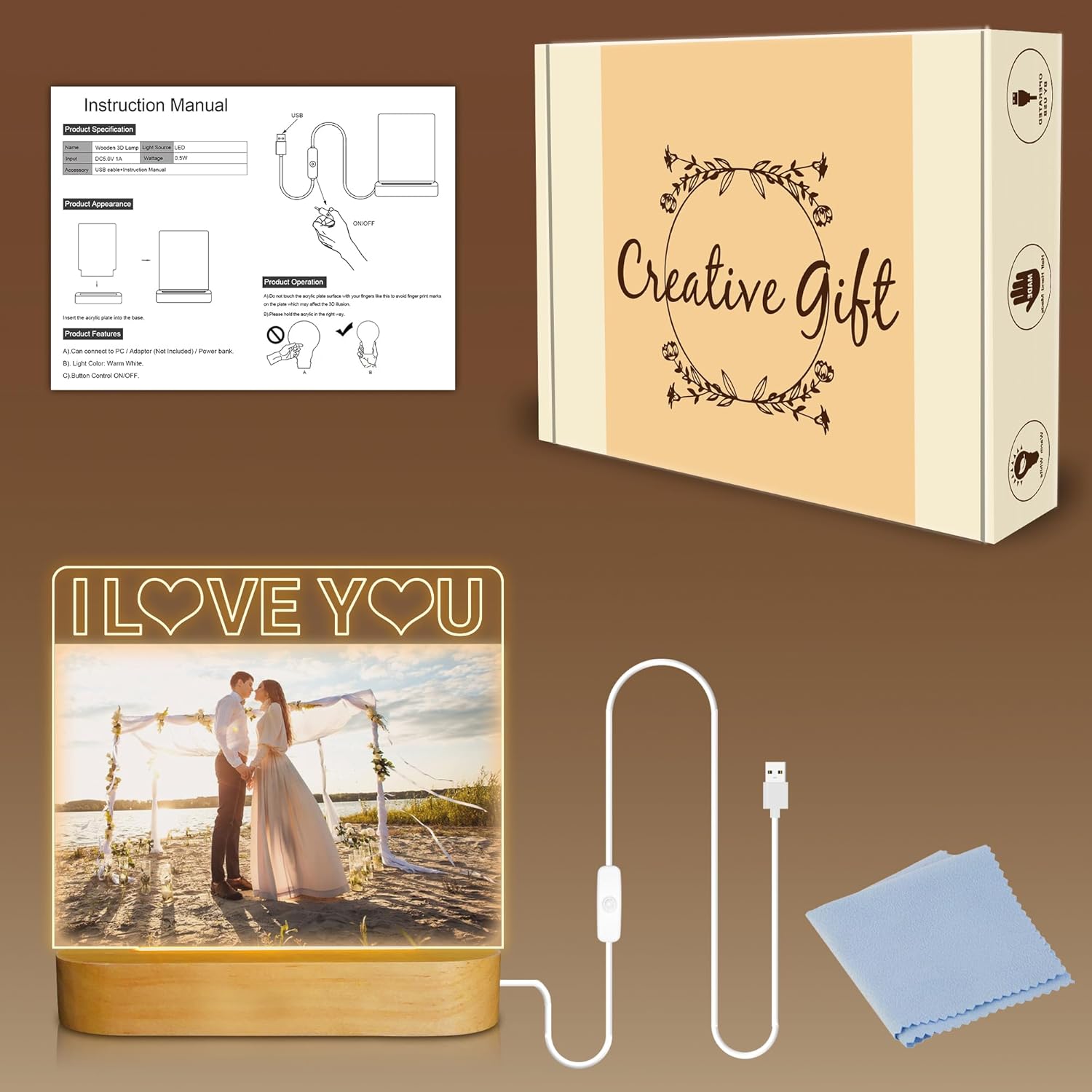 - 【High Quality】The acrylic artwork picture frame is composed of acrylic and base, base is made of high-quality plastic with wood grain paint, the acrylic is not harmful to human body, no pungent smell, no sharp edges, and is durable. Each box come with a soft cloth for cleaning the frame. Night Light is equipped with a standard USB cable to apply to your power bank, laptop, computer or anything else with a USB plug in ability