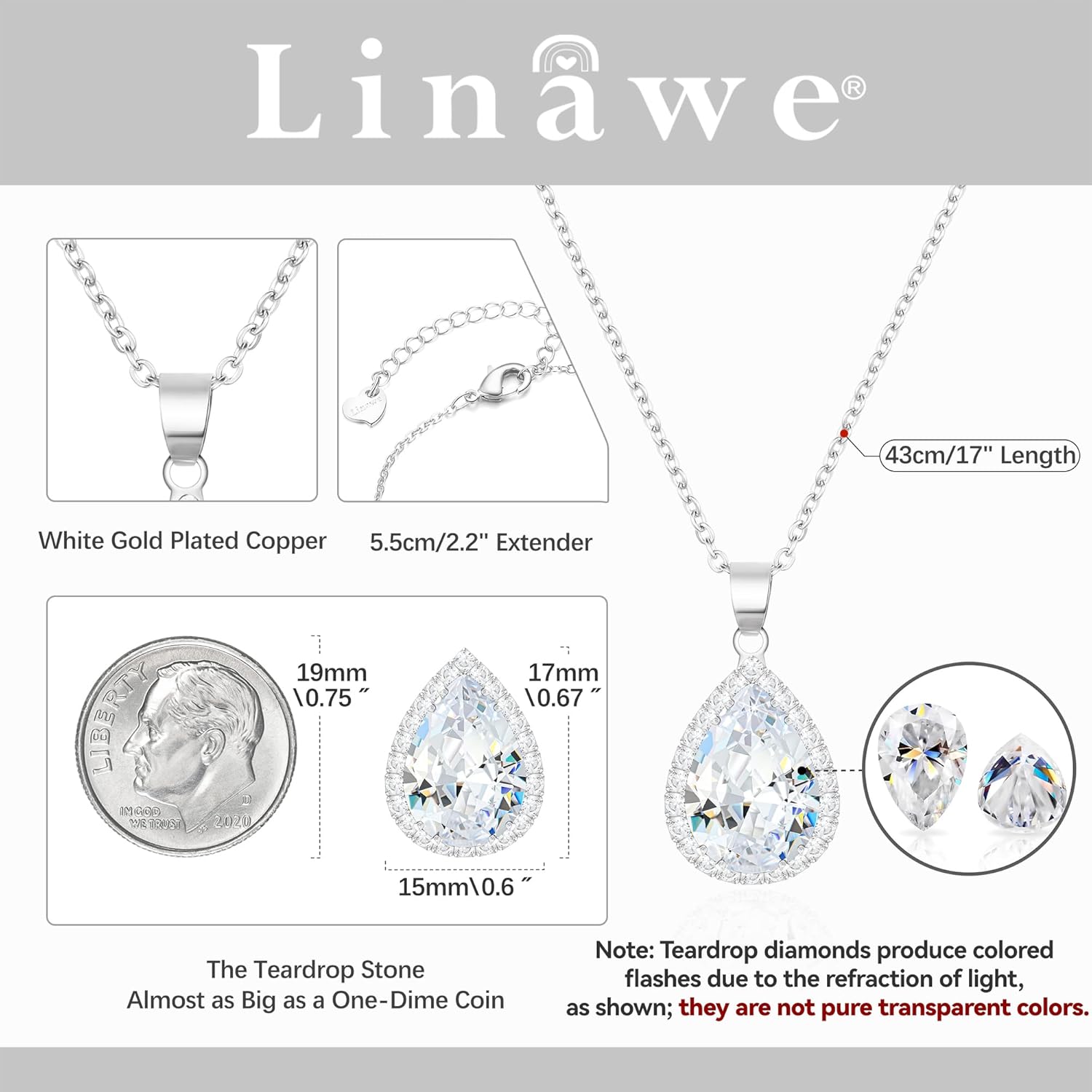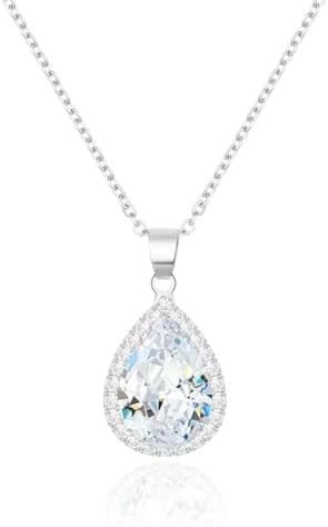 • Crystal Pendant Necklace for Women: This necklace features a sparkling pear-shaped gemstone that captures the light beautifully, the imitation diamond pendant is made of high quality cubic zirconia stones that sparkle in the light. Please noted the teardrop diamonds produce colored flashes due to the refraction of light, as shown; they are not pure transparent colors.