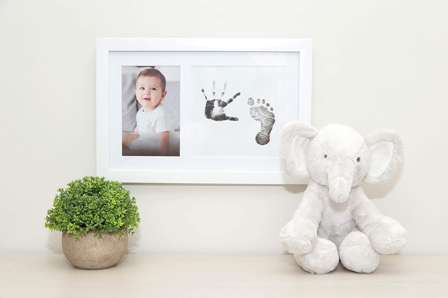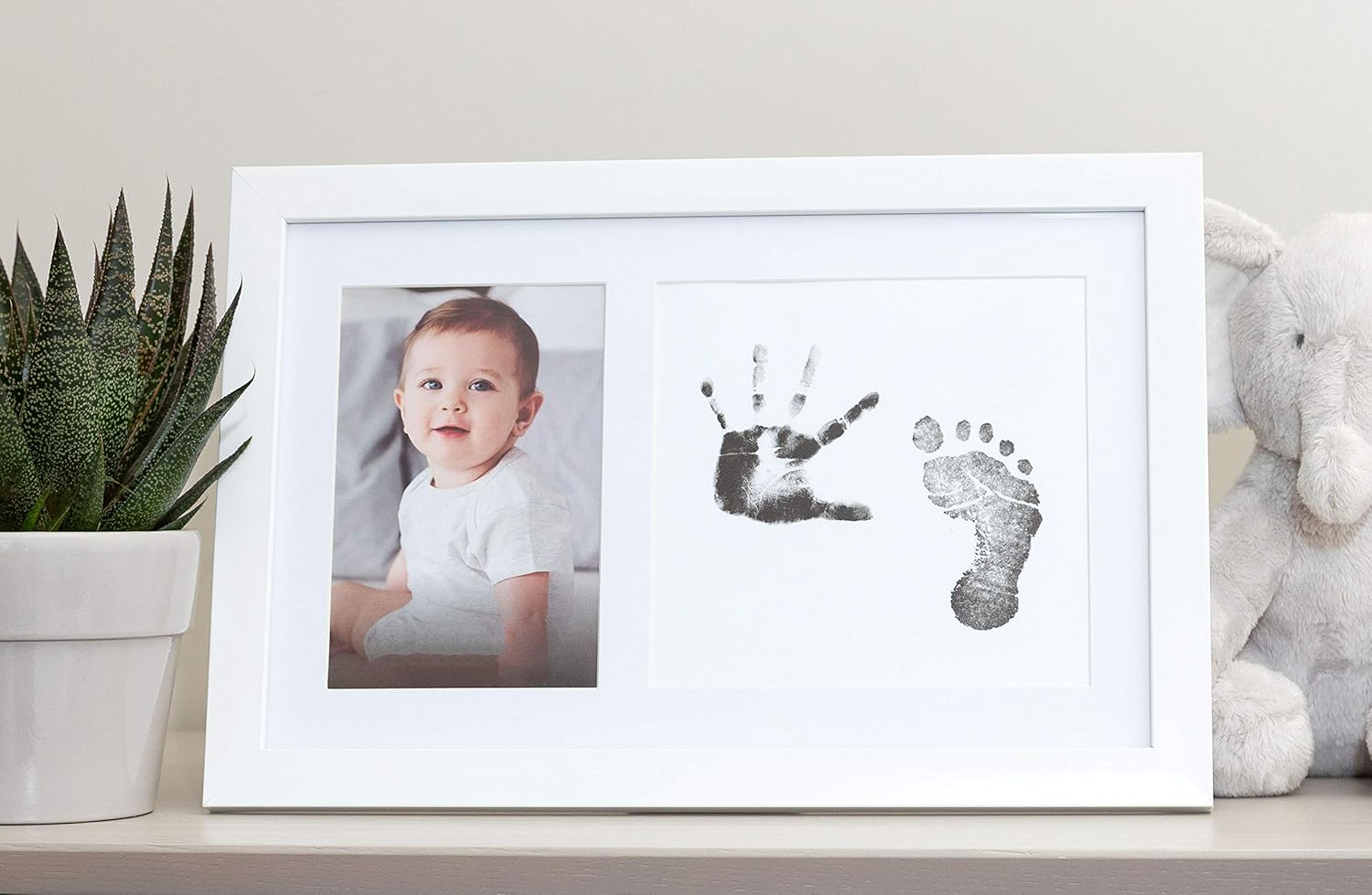 features White frame, Clean-Touch ink pad, 2 print cards, easel & hanger included Ink never touches your baby’s skin; 100% nontoxic ink Fits one 4” x 6” photo alongside handprint & footprint Frame Dimensions: 13″ W x 9.7″ H x 0.5″ D