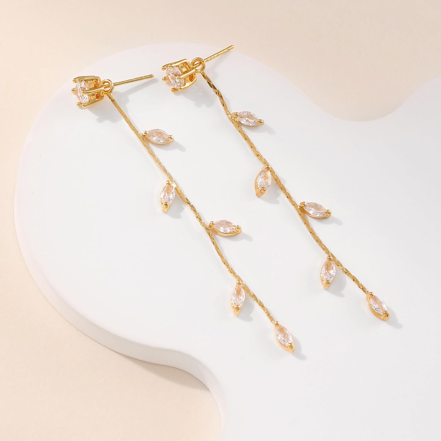 Long Crystal Drop Earrings Dangling Cubiz Zirconia Threader Earrings Crystal Leaf Drop Dangle Earrings for Women Bridal Wedding