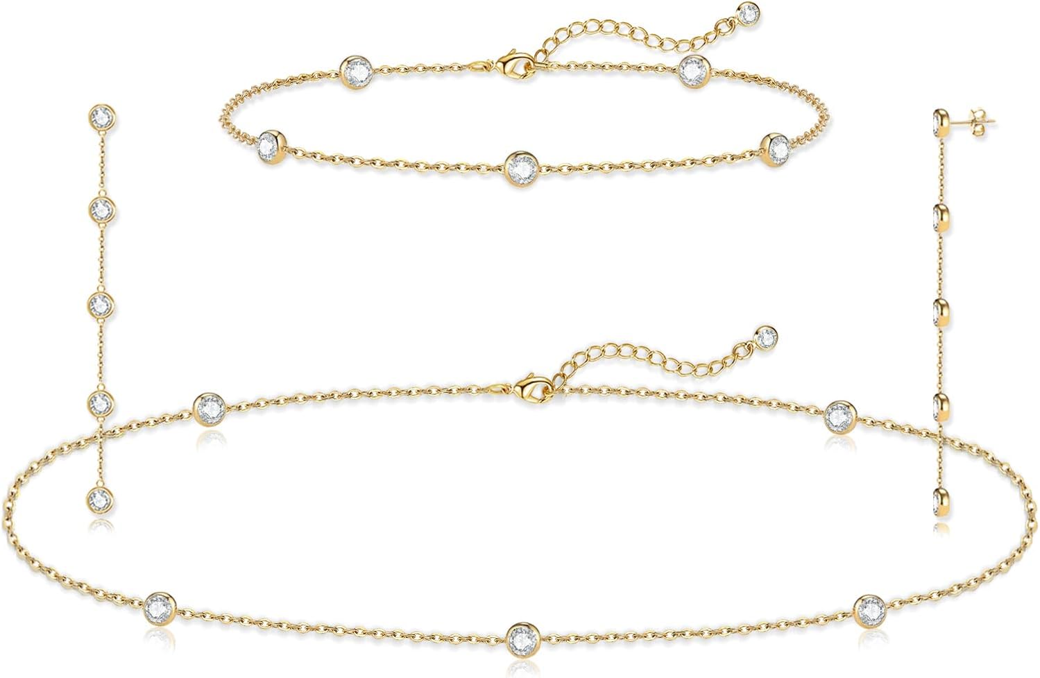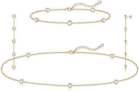 - Gold Jewelry Sets for Women: This gold and diamond jewelry set includes a diamond choker necklace, dainty gold bracelets, and simple dangle earrings. The brightly colored CZ create a dazzling effect. You can wear the whole set of jewelry at once or mix different pieces to showcase an elegant and fashionable style.