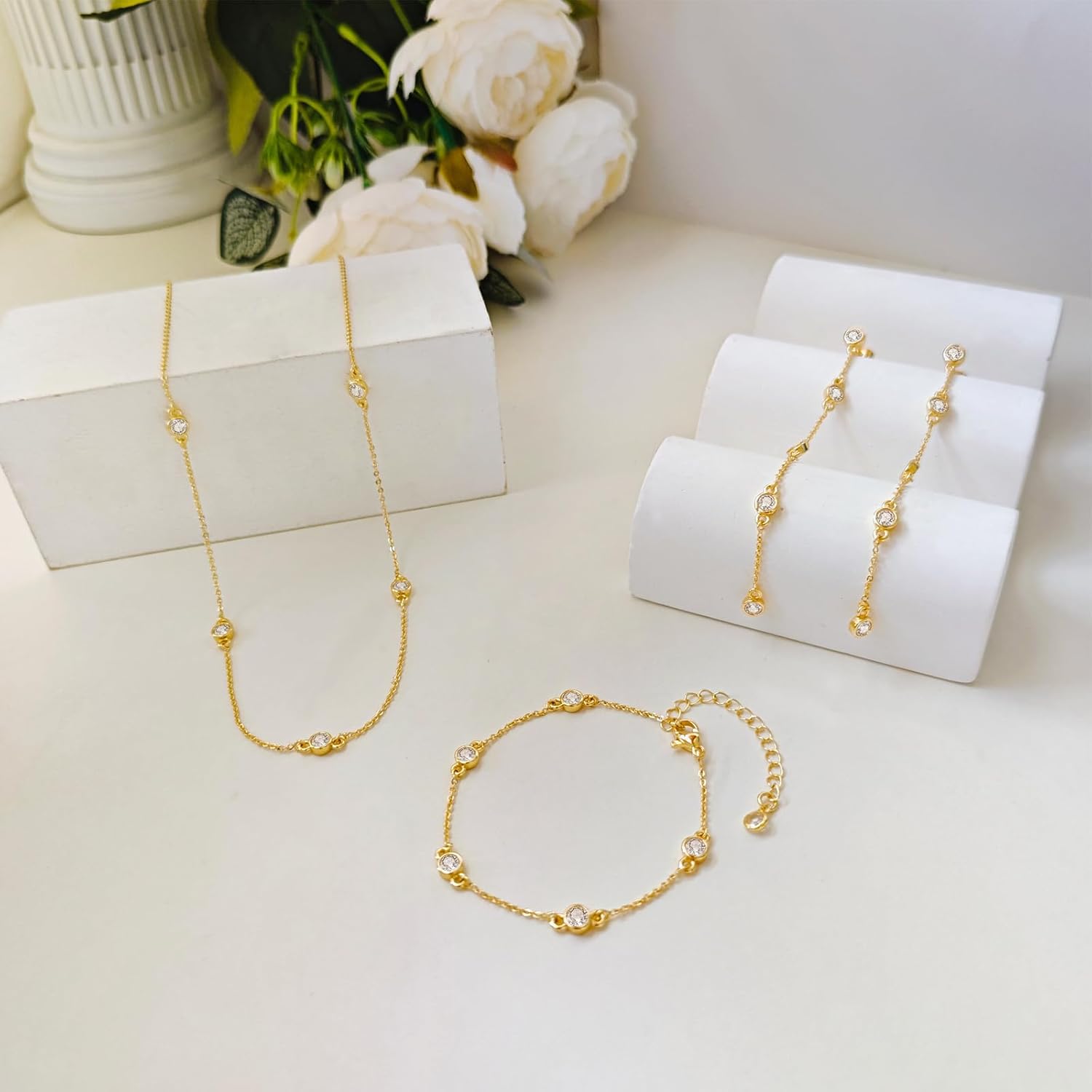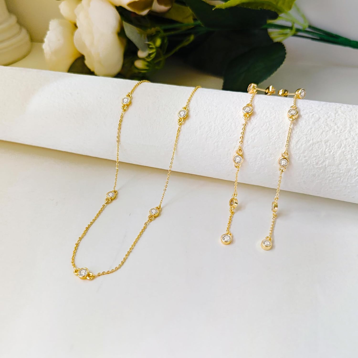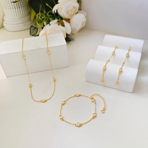 - Gold Necklace and Earring Set: Our gold necklace for women is crafted from brass plated with 14K gold, adorned with unique cz diamonds, making it even more precious. The diamond earrings for women are comfortable to wear, hypoallergenic, very skin-friendly, making them a standout accessory.