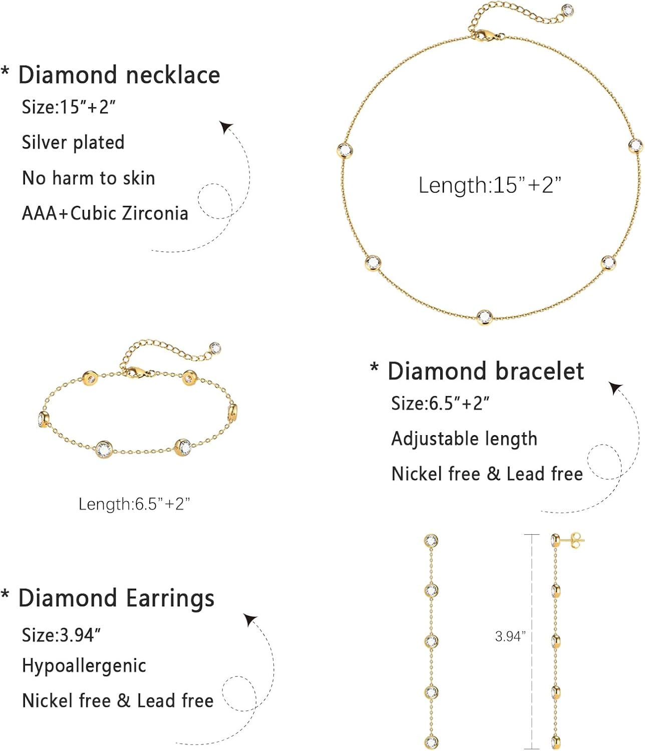 - Diamond Jewelry Size: Gold necklace lengths of 15″ + 2″, gold bracelet lengths of 6″ + 2″, gold earrings are 4″. All diamonds are 4mm in size. The gold chains can be freely adjusted for length to ensure comfortable wearing, maintaining long-lasting beauty and quality, a symbol of eternity.