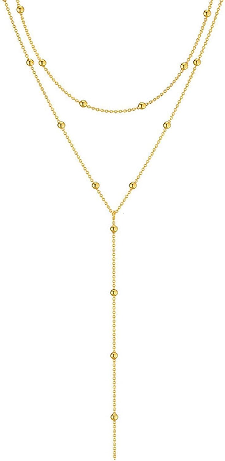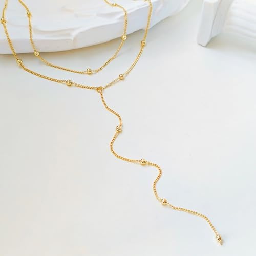Luxval Lariat Gold Necklace for Women, Dainty Long Necklace 14k Gold Plated/Silver Y-Shaped Pendant Necklaces Trendy Beaded Chain Drop Necklaces Jewelry for Women Gifts