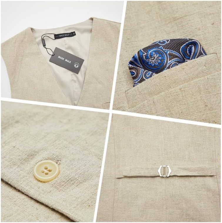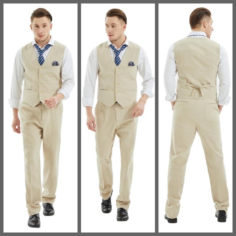 - Feature: Vest with five buttons, V-neck, smooth back, and adjustable back tie in slim fit style; pants feature a flat front, zippered fly, button end, and adjustable waist tab