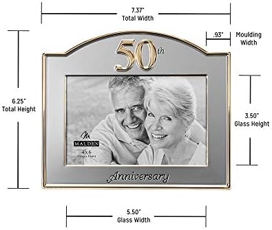 Add a touch of style to your home decor with this attractive Photo Frame. This beautiful frame is the perfect way to display your treasured photos. The frame holds one 4 x 6 horizontal photo and is constructed of two-tone, dimensional Metal. The frame features the phrase 50th Anniversary in both raised and debossed text. This decorative frame has a matte silver finish background which highlights the raised shiny gold finish 50 and inner and outer frame borders. This freestanding, easel backed picture frame will display perfectly on a table or shelf. Optionally, use the attached hardware to create a unique wall display. Swap out photos easily with swing tab closures. Picture Frame includes a durable glass front that will protect and showcase your precious photos for years to come. Celebrate your memories with Malden International Designs 50th Anniversary picture frame. Product Dimensions: Approximately 7.5 (W) x 6.25 (H) x 0.625 (D)