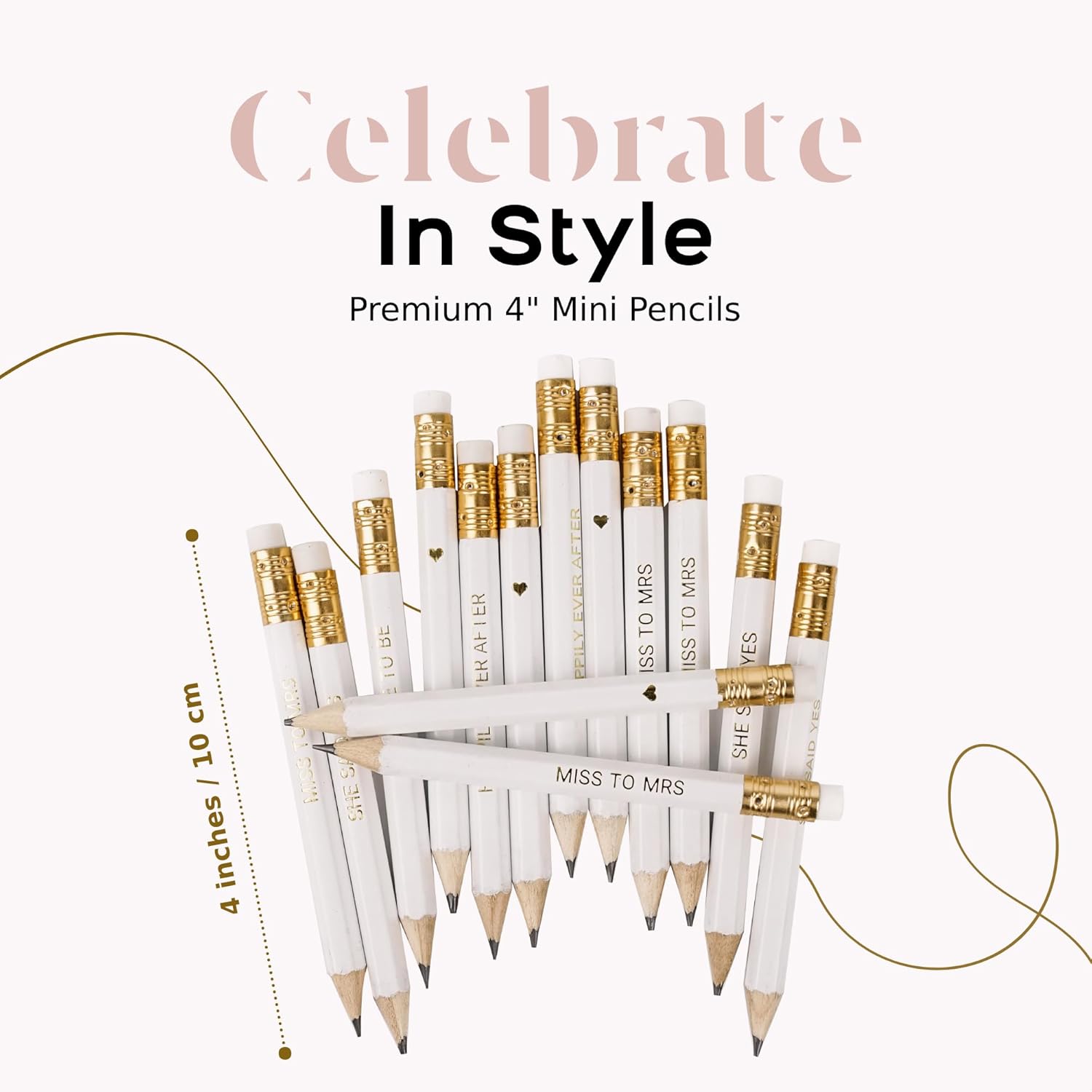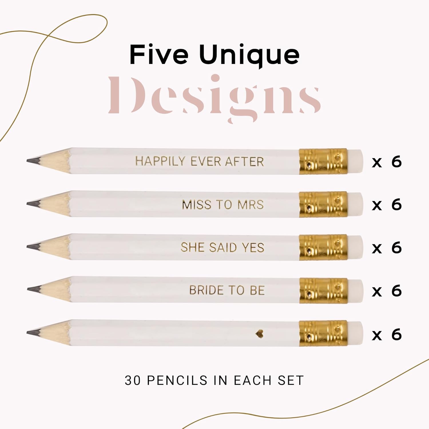 - SMALL DETAILS MATTER—and with five different cute designs, our white bridal pencils add that extra special touch. There are 6 pencils of each design: “♥”, “HAPPILY EVER AFTER”, “BRIDE TO BE”, “MISS TO MRS”, “SHE SAID YES”.