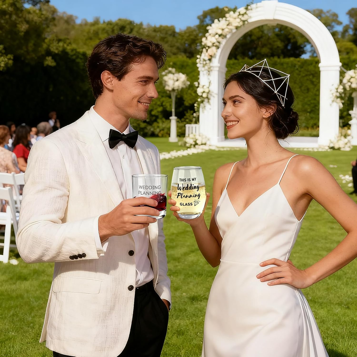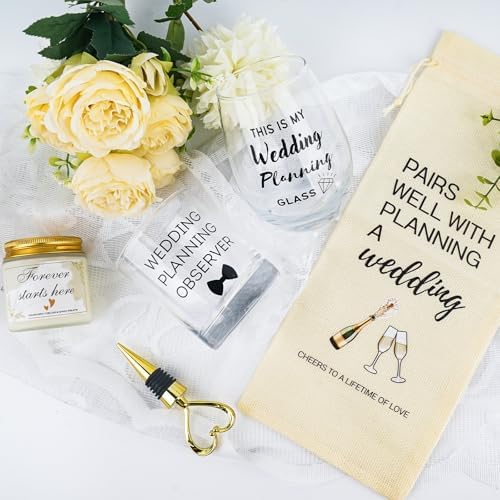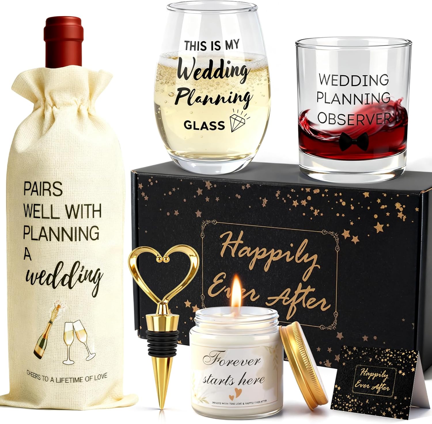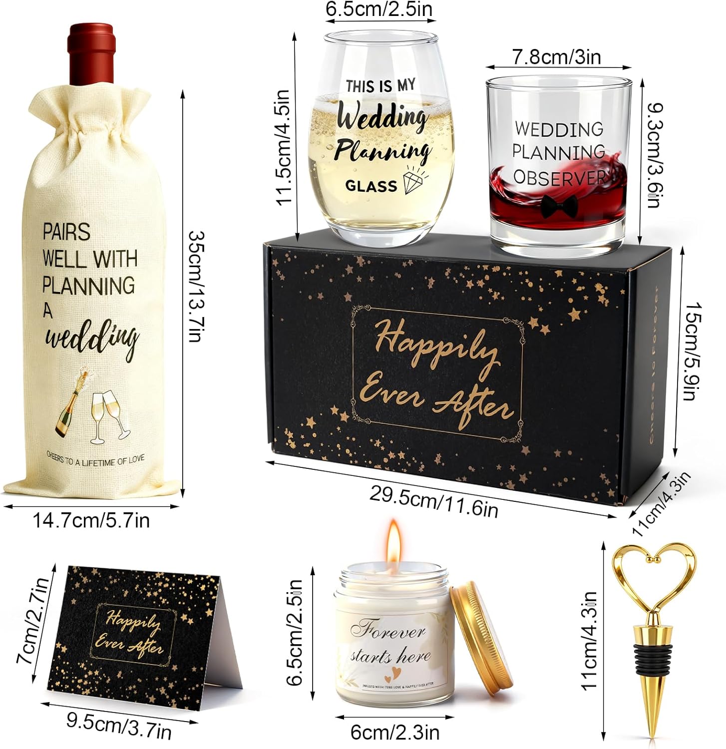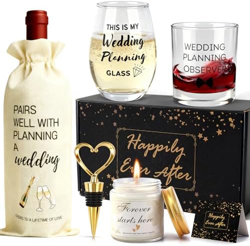 - Engagement Gift Set: Wedding gift set includes, 2pcs wedding couple wine glasses, 1pcs Heart Shape Wine Bottle Stoppers, 1pcs candle, 1pcs wine bag, 1pcs engagement gift box, 1pcs engagement greeting card