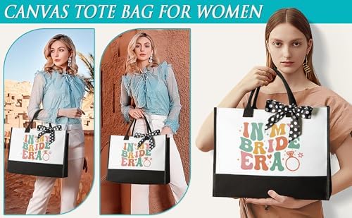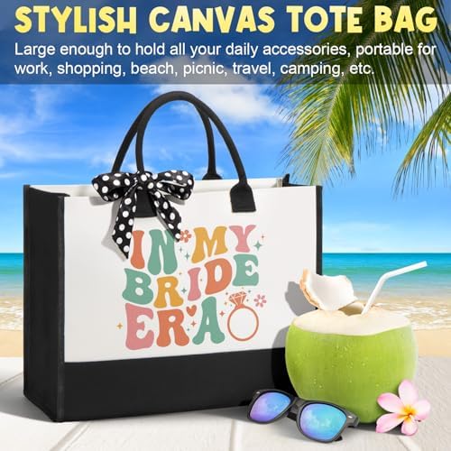 - SYTLISH CANVAS TOTE BAG: MAYICIVO Canvas Beach Bag (17″x 13″x 7″ ) is made of high-quality cotton canvas with double stitches, durable, roomy enough to hold all daily essentials. Sturdy & comfort handle makes it portable for work, shopping, travel, beach, picnic, etc. A cute polka dot ribbon is provided as tote bag decor, with warm text printing “IN MY BRIDE ERA”, impress her at first sight and bring smile to her face, definitely a cool bridal shower gifts for bride to be wedding gifts