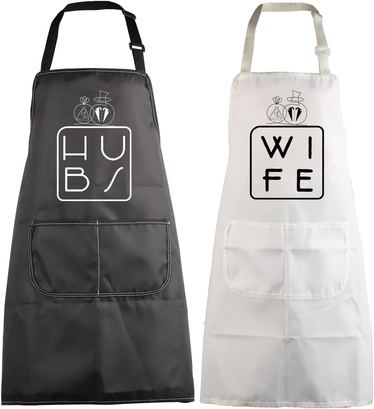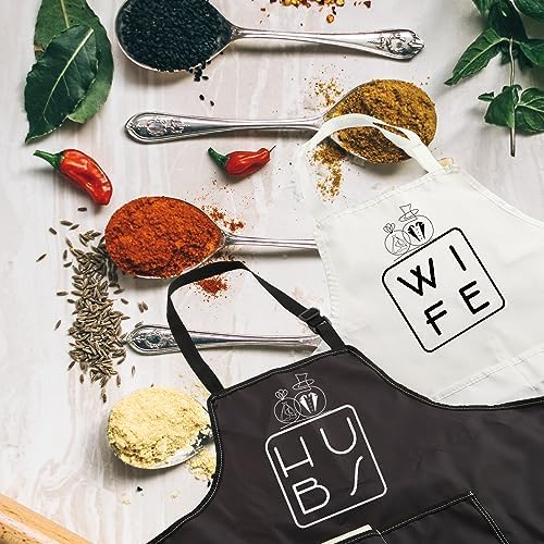 • HUBS Apron + WIFE Apron fabric is thick, wear-resistant, durable, non-pilling and easy to clean, they are effectively to keep your clothes clean and dry. Awesome gifts for husband wife bridal shower gifts, wedding gifts for the couple engagement gifts, wedding anniversary gifts, couples wedding aprons for newlyweds, funny bride groom gifts.