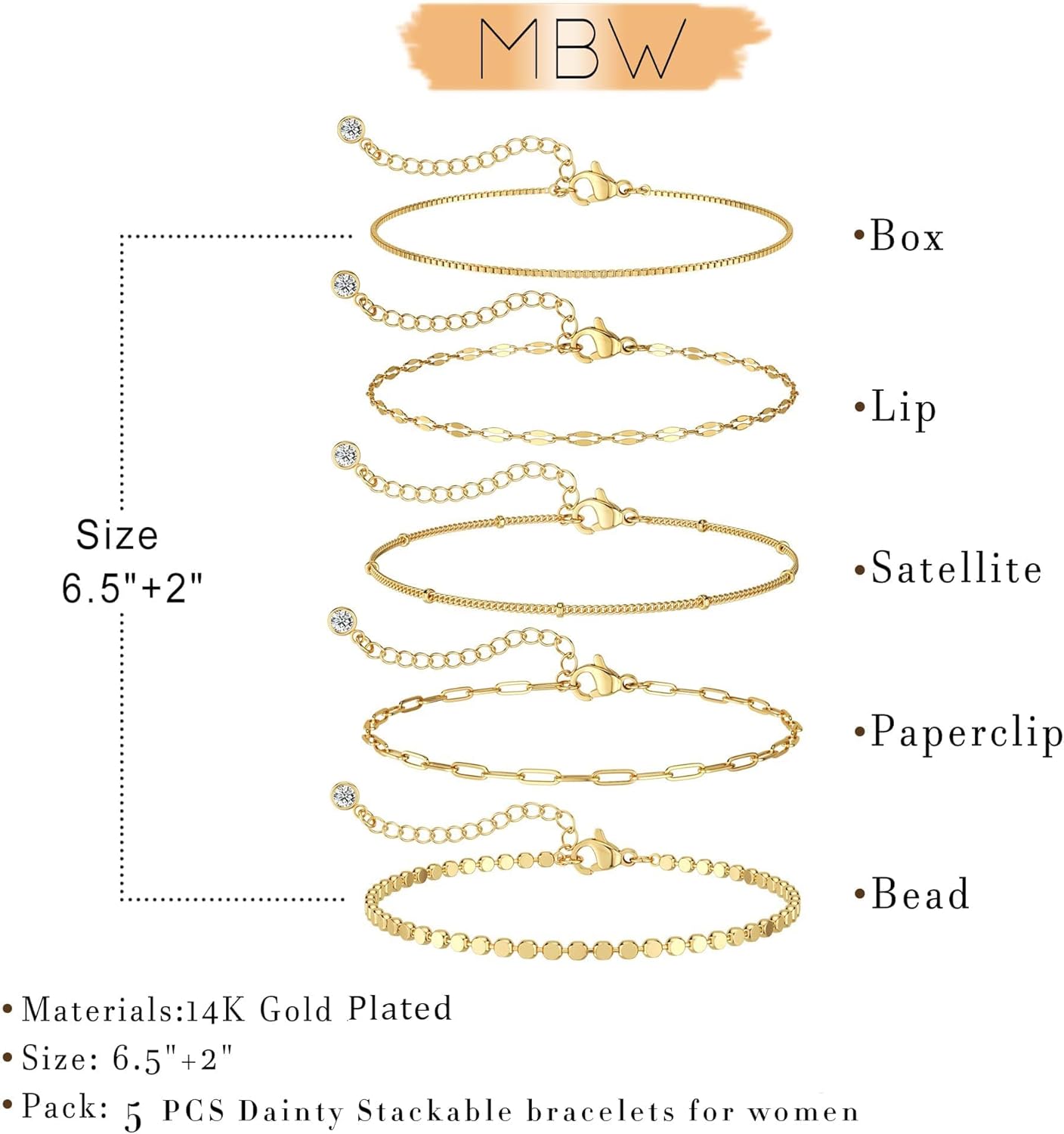 MBW Gold Bracelets for Women Trendy, Dainty 14K Gold Plated Bracelet Stack Beaded Chain Bracelet Set Thin Small Cute Paperclip Bracelets Fashion Waterproof Jewelry Gift Gold Accessories for Women
