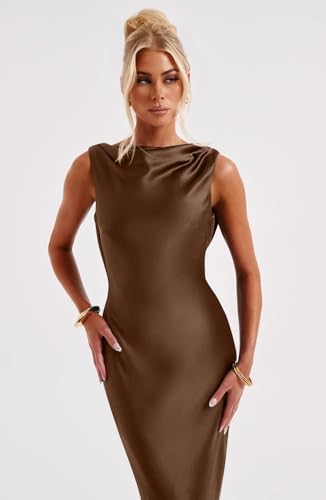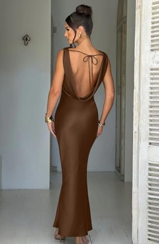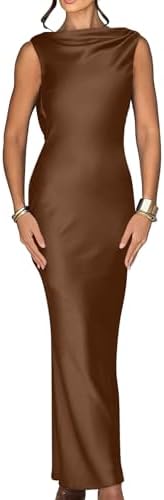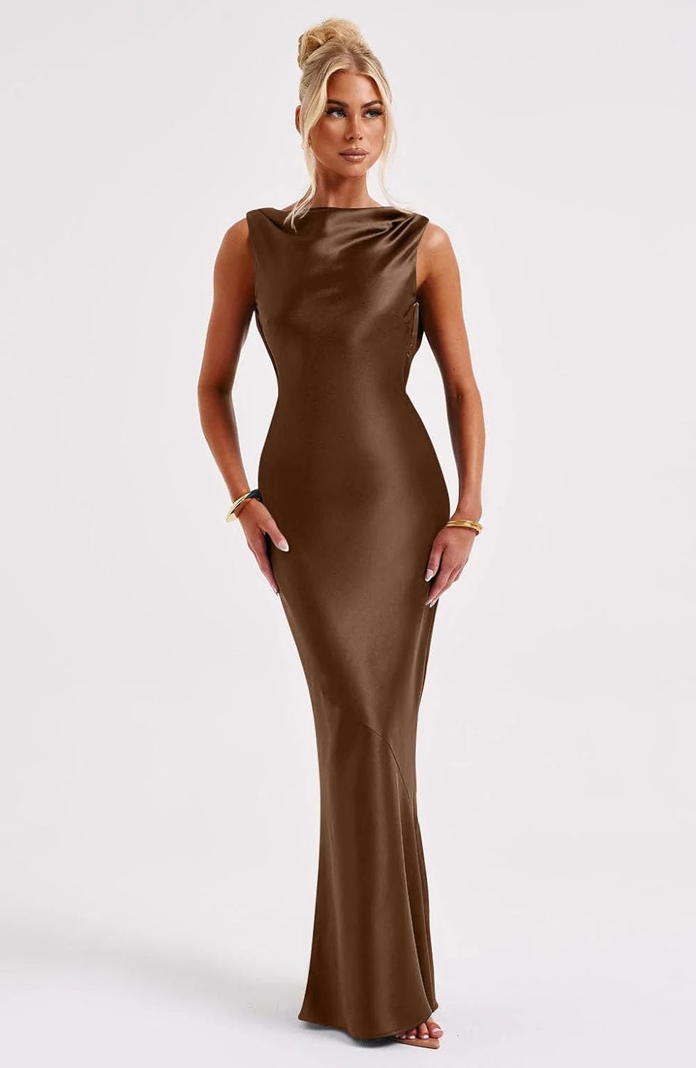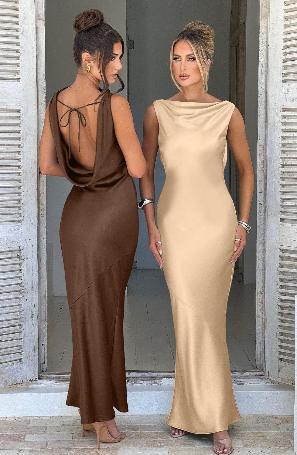- Design:This maxi dress made from premium satin which drapes beautifully and hugs the body in all the right places. With a high neck and adjustable neck ties,fluid skirt.this design is complete with a showstopping cut out back.