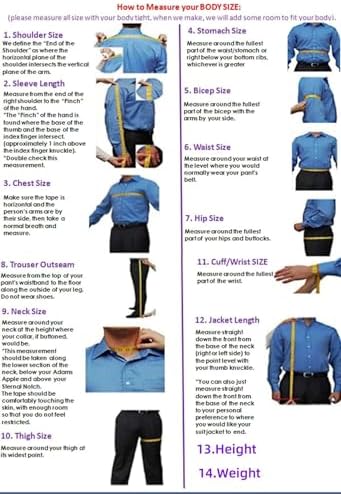 - 【Custom Tailoring Available】–Please provide your precise body measurements (ensure there is NO extra room when measuring) for a made-to-order fit:1.Shoulder;2.Sleeve Length;3.Chest;4.Belly;5.Bicep;6.Waist;7.Hips;8.Outseam;9.Neckline;10.Thigh;11.Cuff;12.Jacket Length;13. Height;14.Weight.