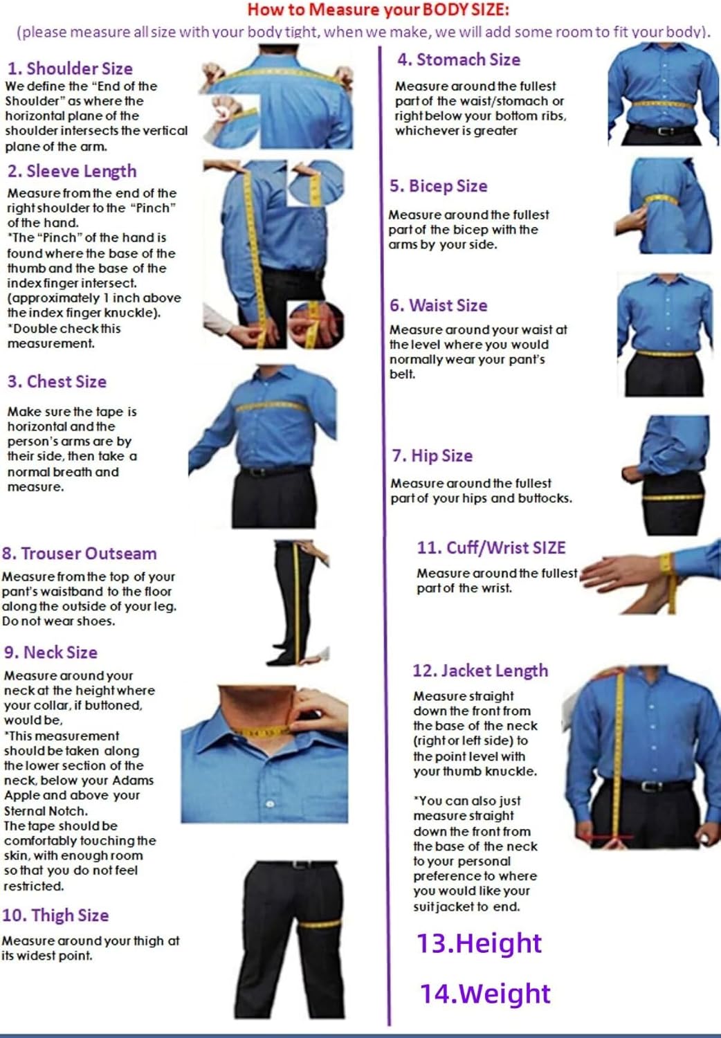 Elevate your presence and command every room in our meticulously crafted Men’s 2-Piece Suit. Designed for the modern gentleman who refuses to compromise on style or comfort, this sophisticated suit merges timeless elegance with contemporary 3D cutting technology. Whether you’re the groom at a wedding, the guest of honor at a gala,or closing a decisive business meeting, this suit is your ultimate weapon for making a powerful, confident, and unforgettable statement. The recommended height and weight are provided for reference purposes only.For detailed information, please consult the size chart. XS– Height5ft-5ft4/Weight110-120lbs S– Height 5ft4-5ft 6/Weight 120-135lbs M–Height 5f6–5ft8/Weight 135-145lbs L– Height 5f8–6ft/Weight 145-155lbs XL– Height 6ft-6ft1/Weight 155-165lbs XXL– Height 6ft1-6ft3/Weight 165-175lbs XXXL– Height 6ft3-6ft4/Weight 175-185lbs 4XL– Height 6ft4-6ft6/Weight 185-200lbs 5XL– Height >6ft6/Weight >200lbs If you require a custom size, please do not hesitate to contact us . Please provide your body measurements in the following format. When measuring,please ensure that there is no extra space,as our tailor will know how to account for any necessary allowances. 1.Shoulder to Shoulder =___ in/cm 2.Sleeve Length =____ in/cm 3.Chest= ____in/cm 4.Belly=____in/cm 5.Bicep=____ in/cm 6.Waist =_____ in/cm 7.Hips= _____ in/cm 8.Trouser Outseam= _____ in/cm 9.Neckline=________ in/cm 10.Thigh=_______in/cm 11,Cuff=_______in/cm 12,Jacket Length=_______in/cm 13,Height=_______in/cm 14.Weight=_______lbs/kg