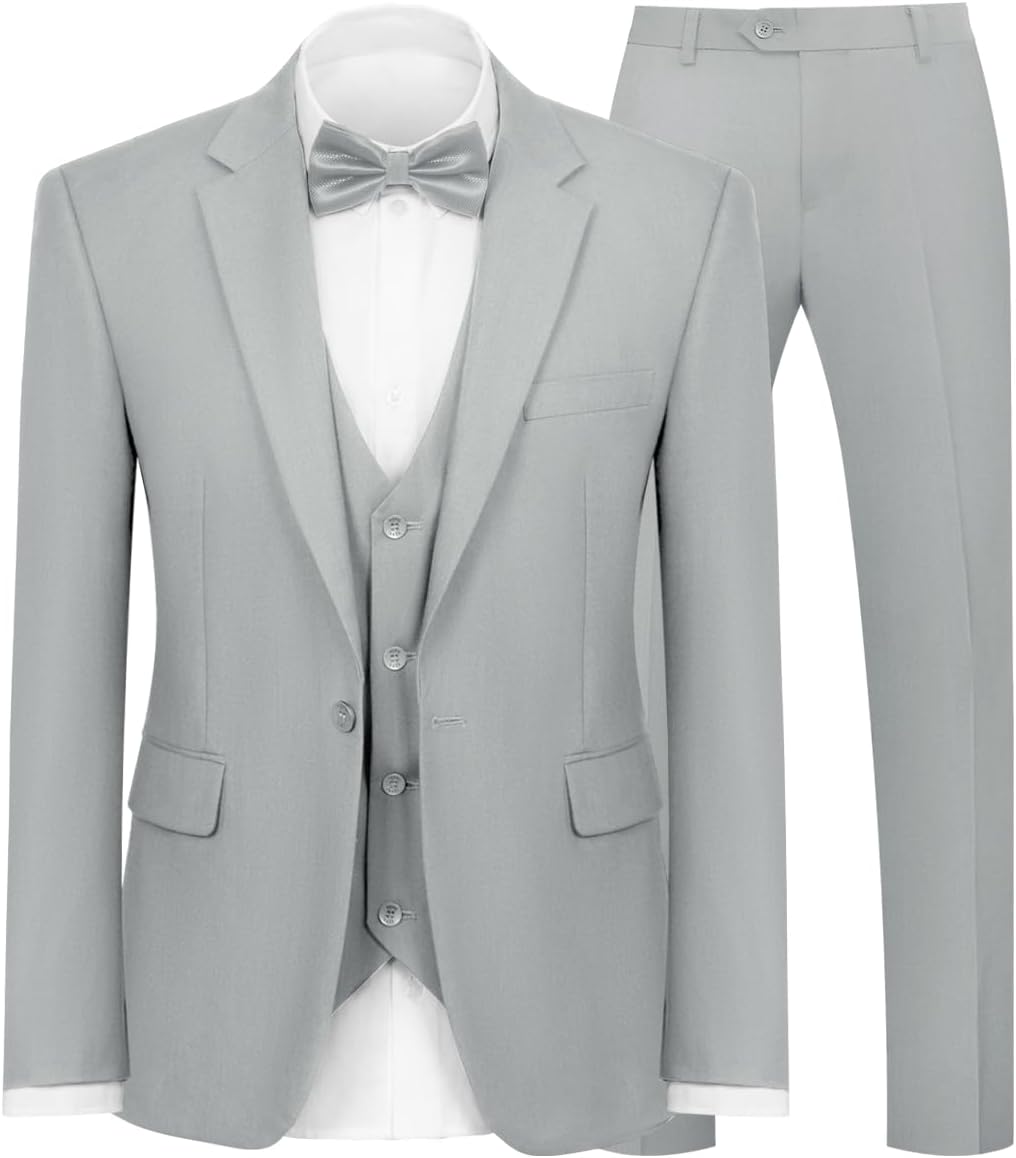 Mens 3-Piece Slim Fit Suit with Bow Tie, Single Button Blazer Vest Pants Set for Wedding Business, Formal Suit for Men