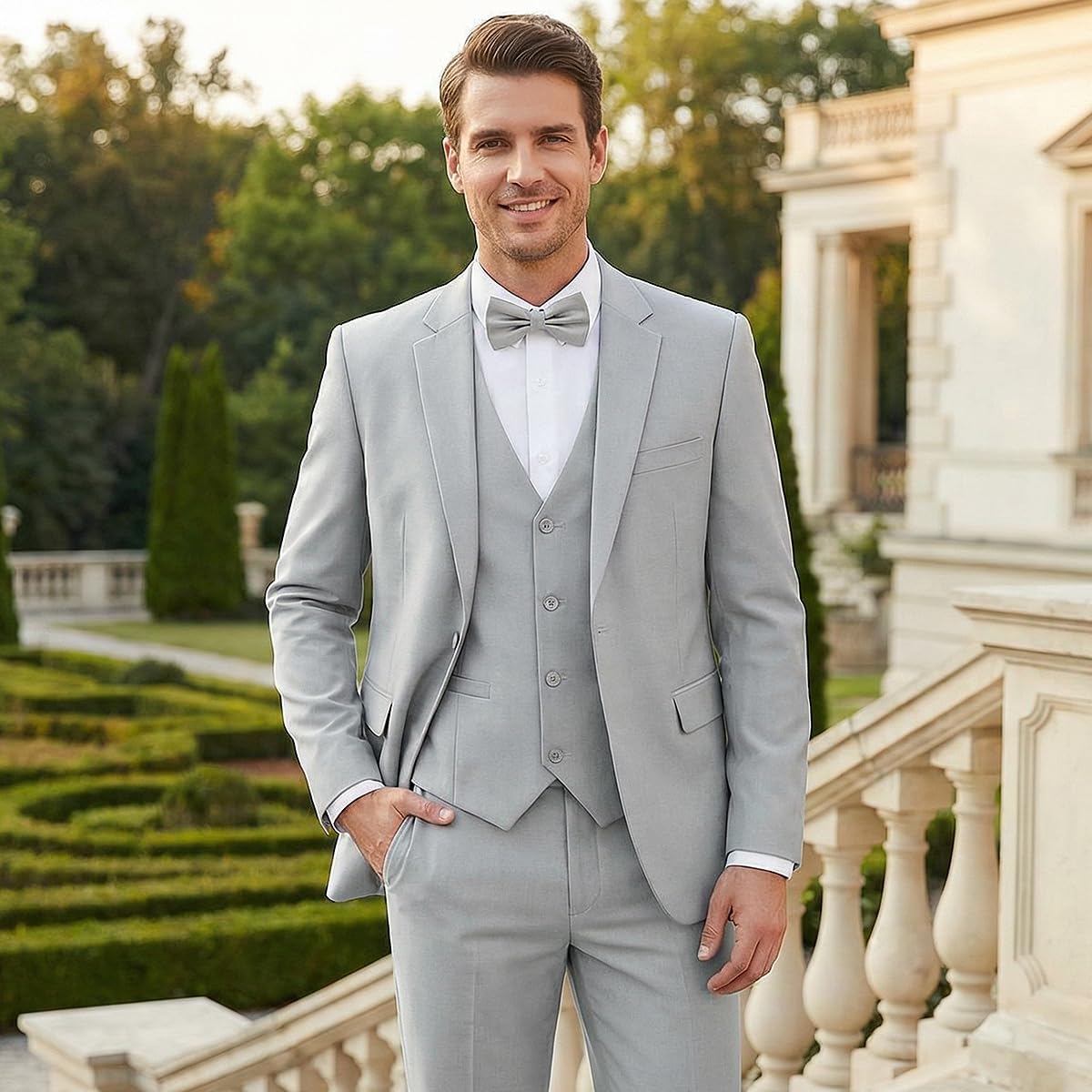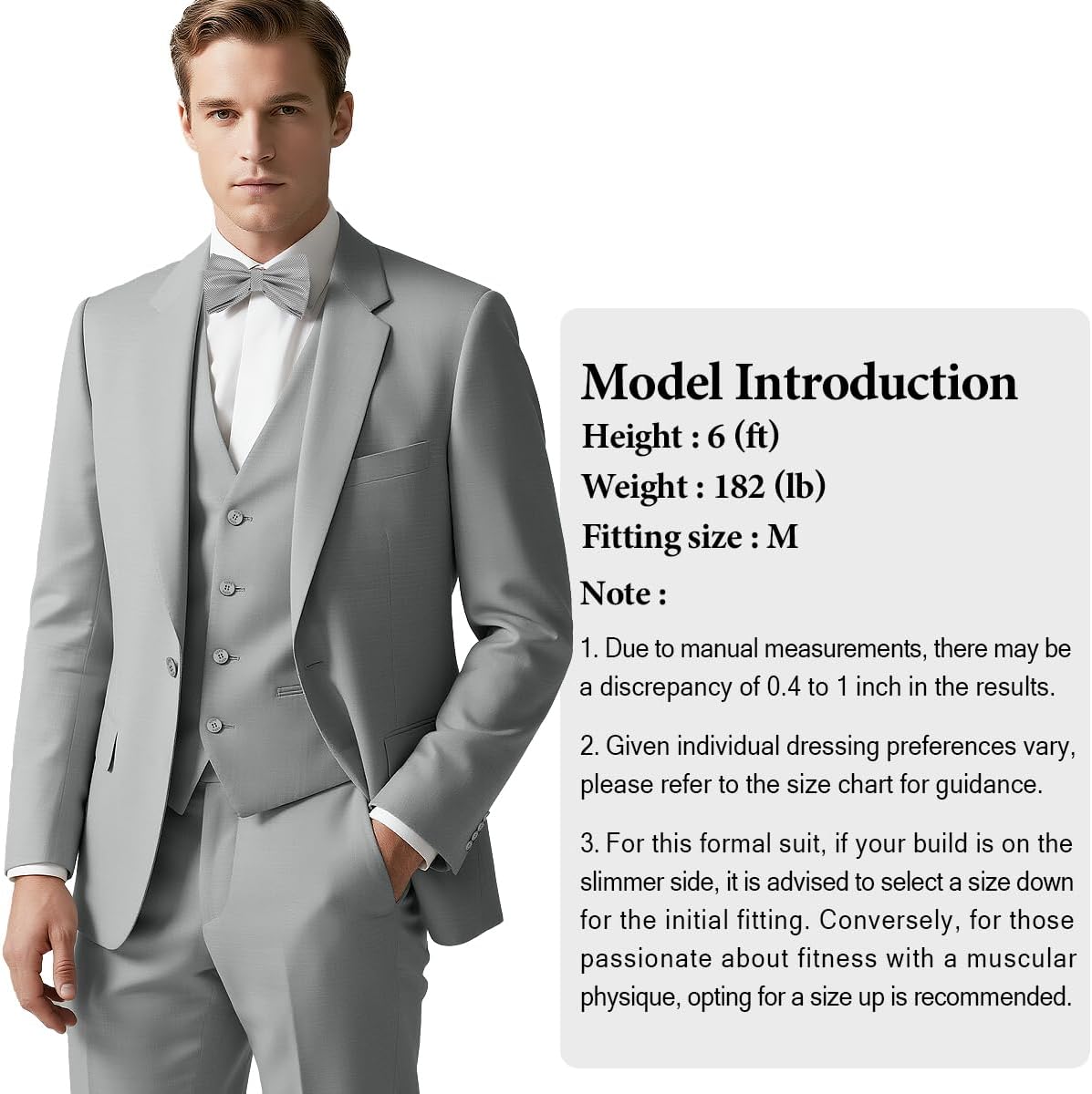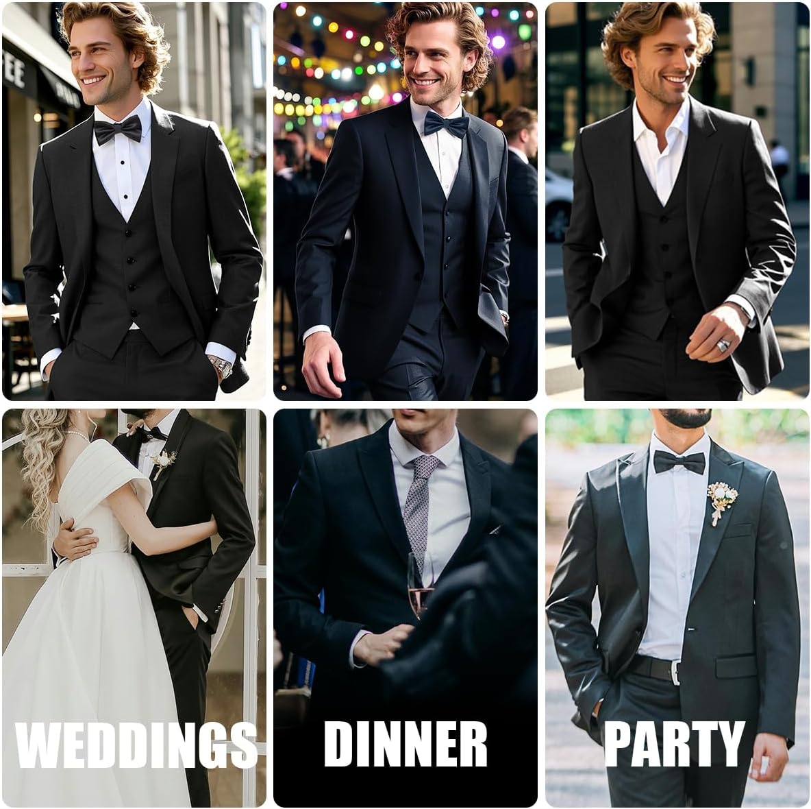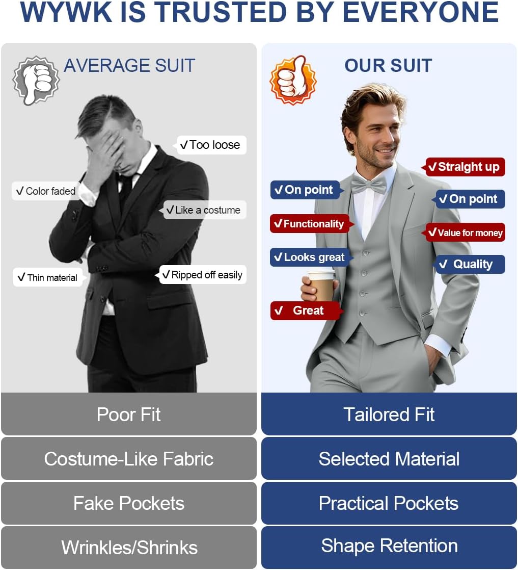 All-In-One Set: 3-piece suit (jacket+vest+pants) + bow tie, multi-fit optional, ready to wear.Dual Occasions: Classic/regular fit, formal & casual, seamless switch for wedding/business.Wrinkle-Resistant: Blended fabric, travel-friendly, no frequent ironing