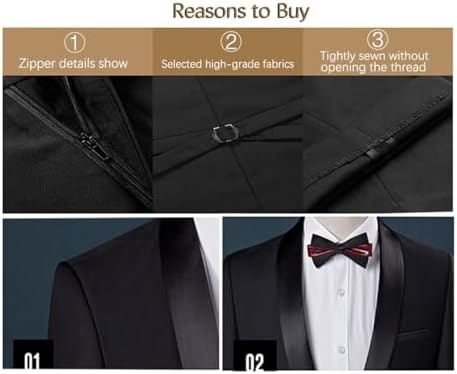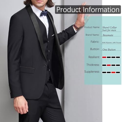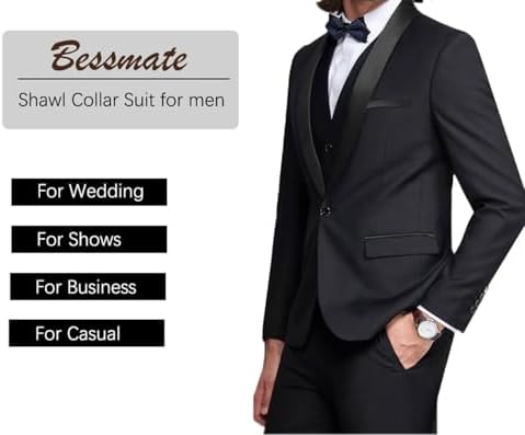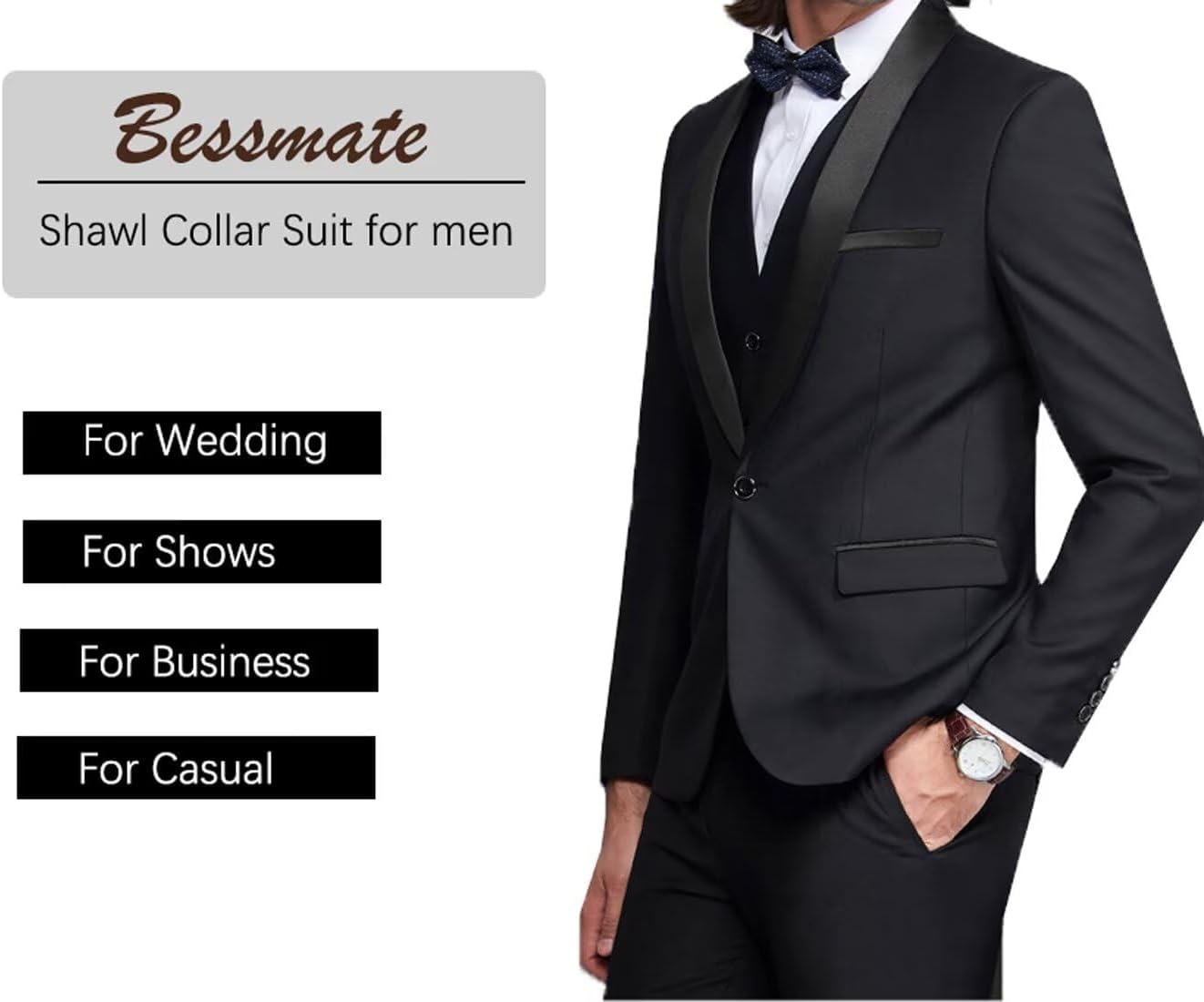 • ✔DESIGN: Bessmate suits for men 3 piece Set. Suit jackets: Featuring a slim fit design With a black satin collar and Single button on front design, Bilateral bifurcation on lower back; Vest: four-button closure; Suit Pants: There is an invisible bandage at the waist that can be adjusted to be elastic and unconstrained, making the slim fit suit more tight than a regular suit.