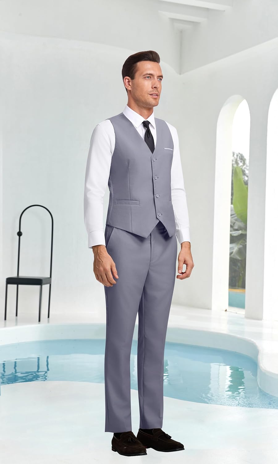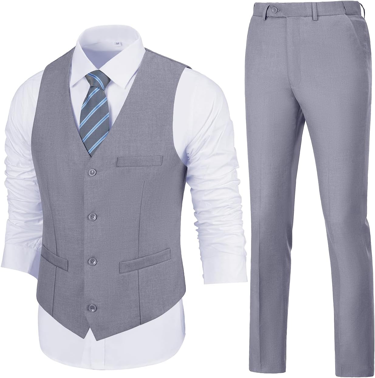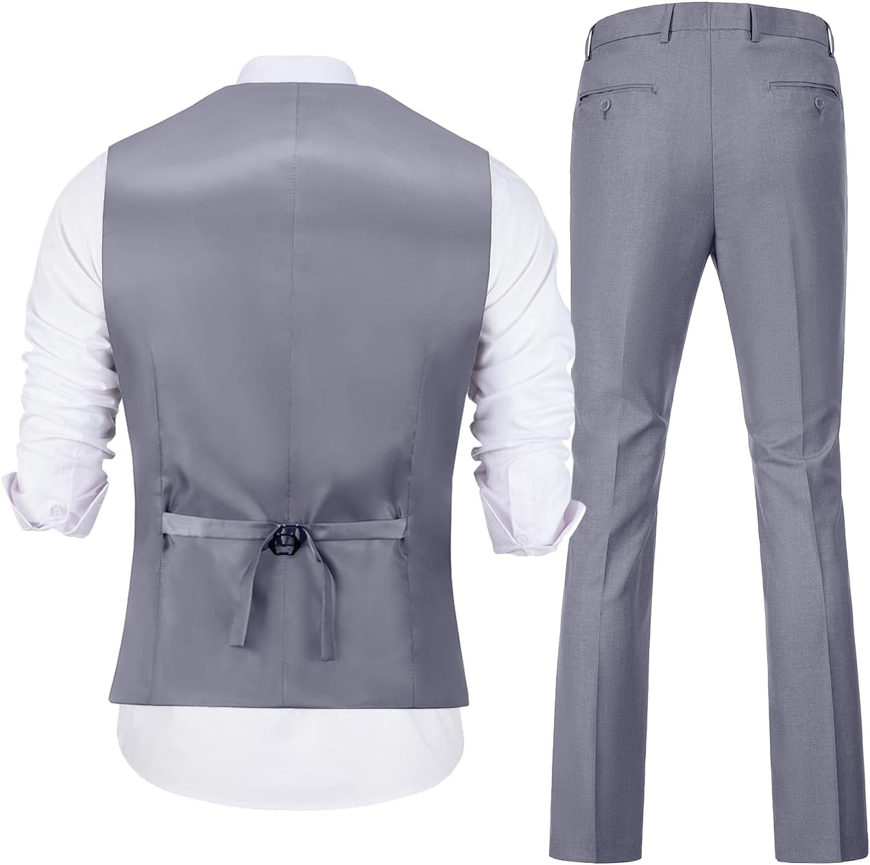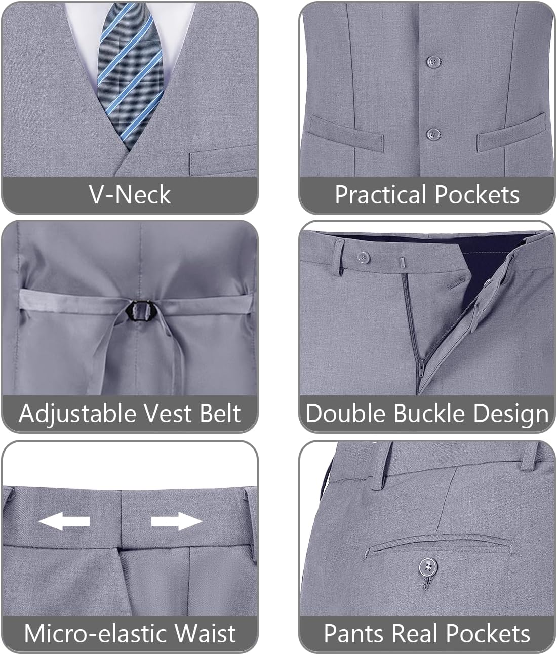 - 【Unique Design】: Vest: V-neck, Resin buttons of the same color, Adjustable back belt, 3 practical pockets. Pants: Flat Front Design Suit Pants with Elasticated Bands, 2 Slant Pockets and 2 Back Pockets.
