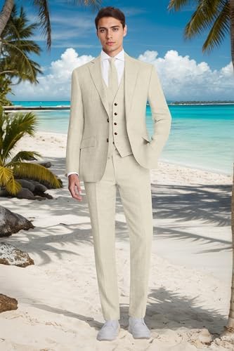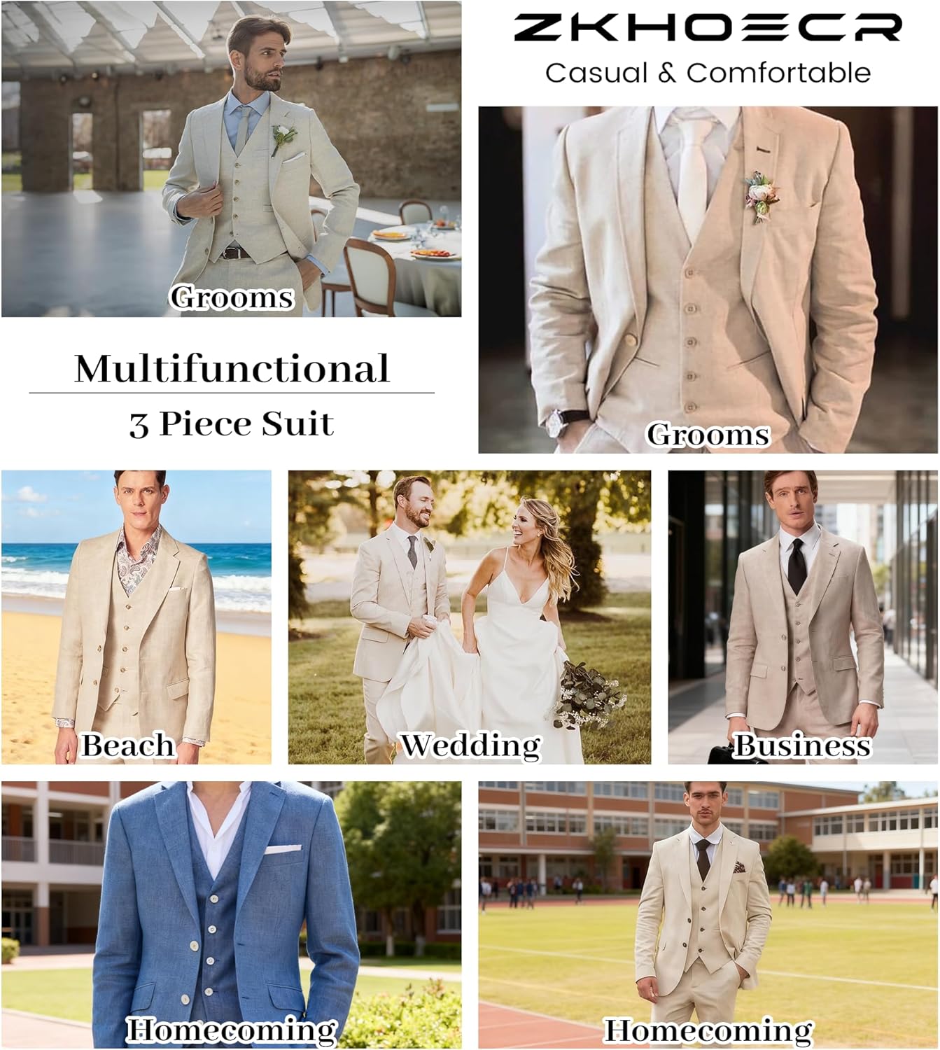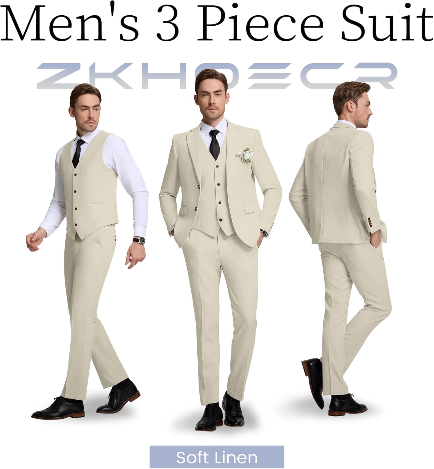 Mens Suit 3 Piece Linen Suits Slim Fit Suit Blazer Vest Pants Set Wedding Prom Tuxedos Business Casual Suit
