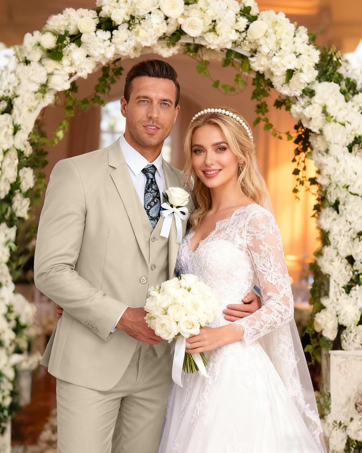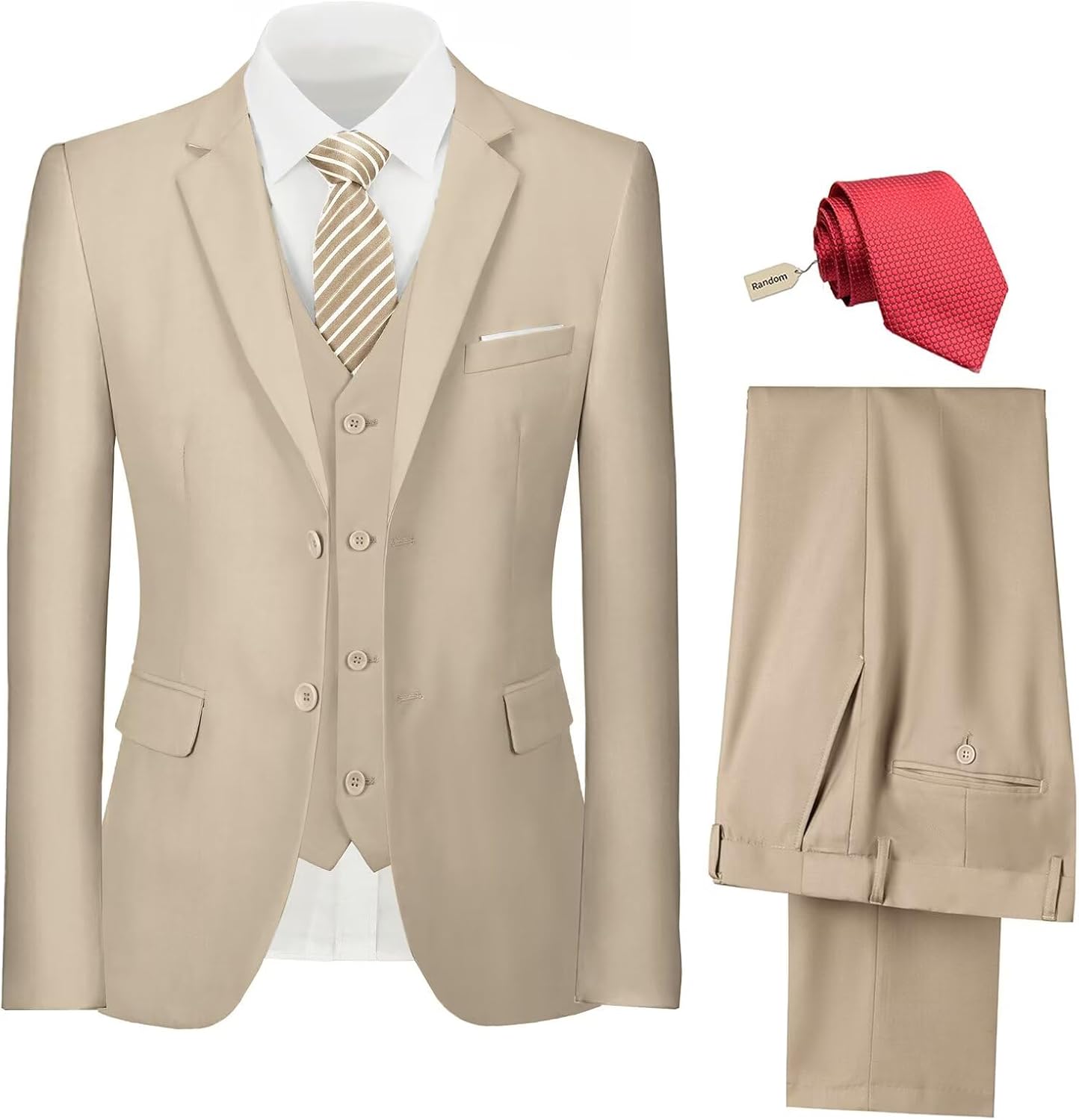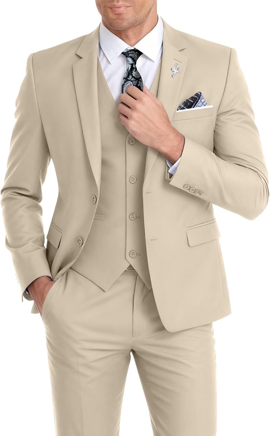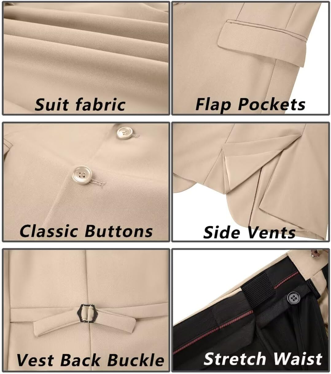 - High-Quality Material-4 Pieces : Jacket: Single breasted/ Two buttons/ Notch lapel; Pants: Flat front/ Expandable waist; Vest: buttons/ V-neck vest;a high-quality tie*1. Soft and comfortable, absorbent,good air permeability, can reduce skin irritation.