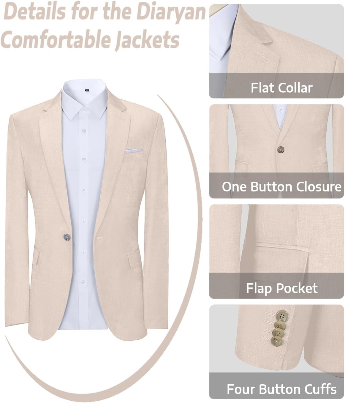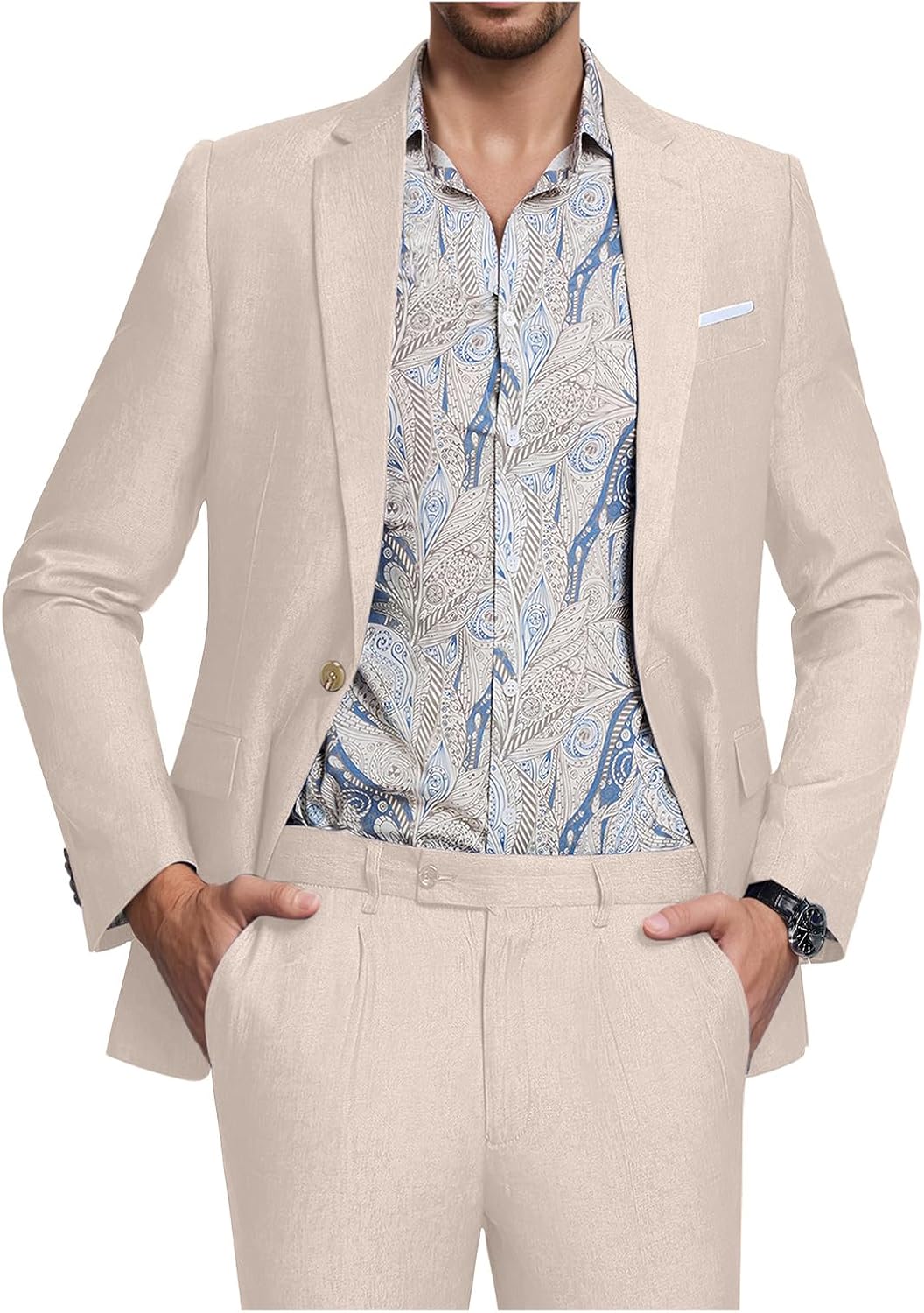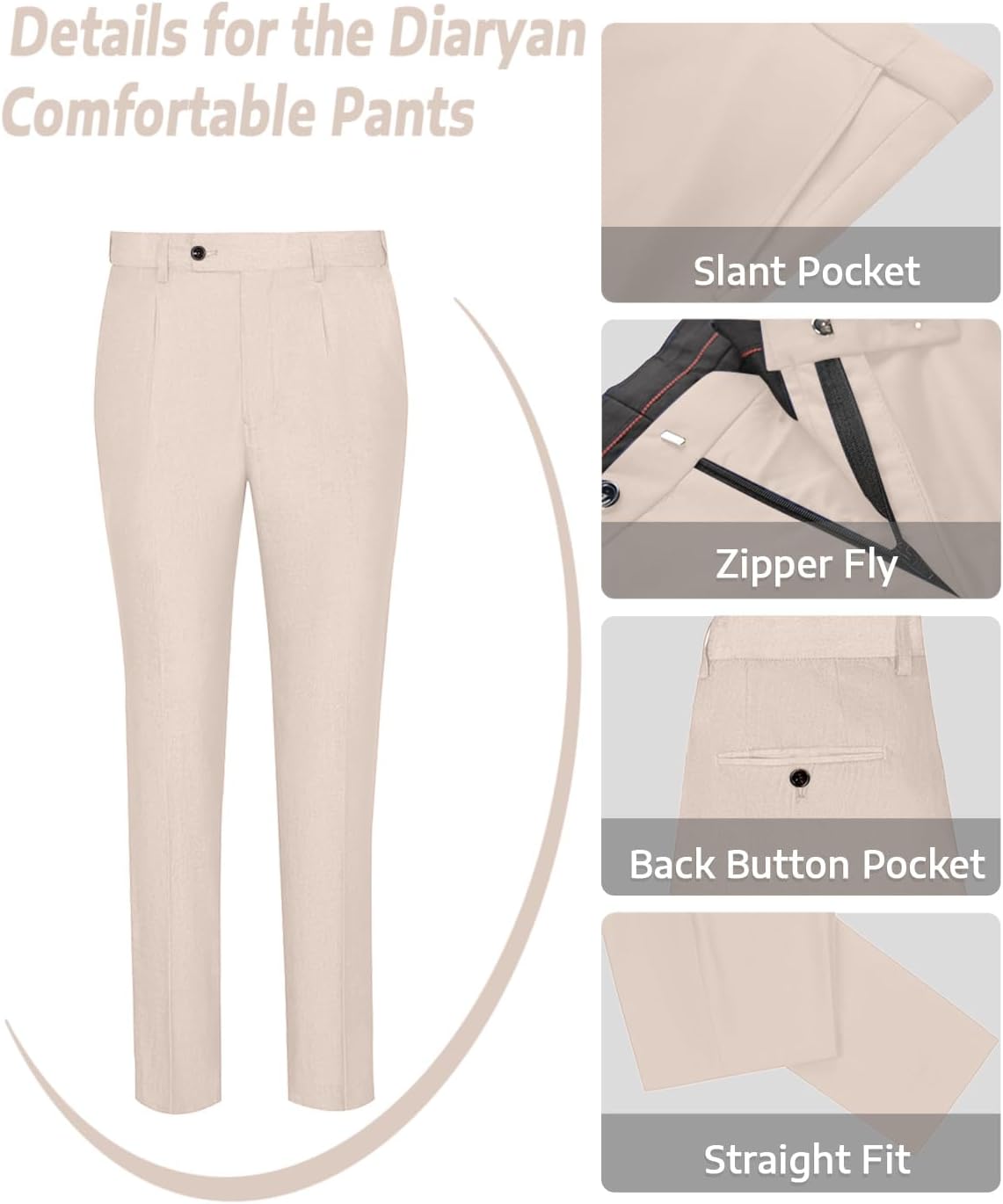 - Unique Style Design Men Suits: Blazer: Single button closure, notched lapel collar, two side flap pockets, inside pockets; Pants: Flat front, zipper fly, button end and adjustable waist tab, two front slash pockets, two back welt pockets with buttons.