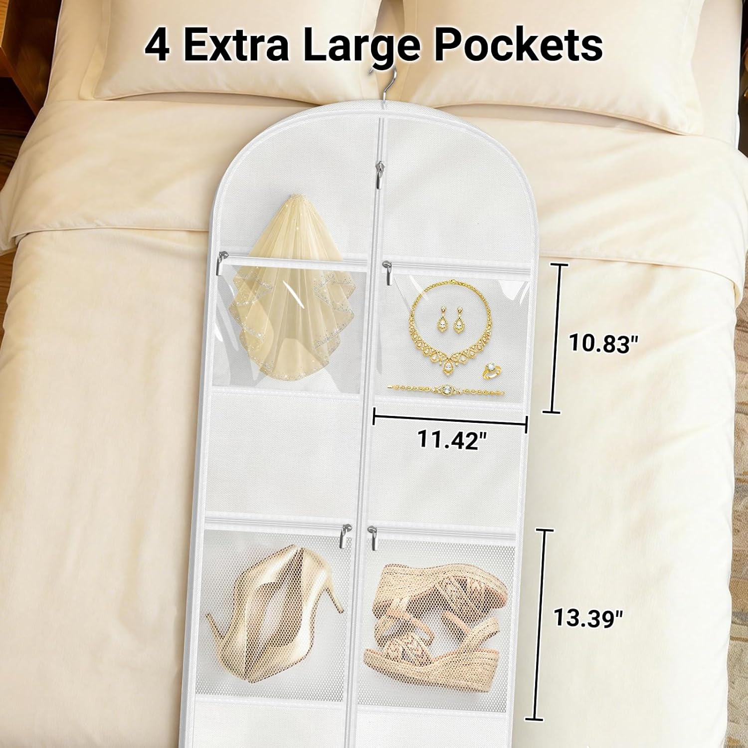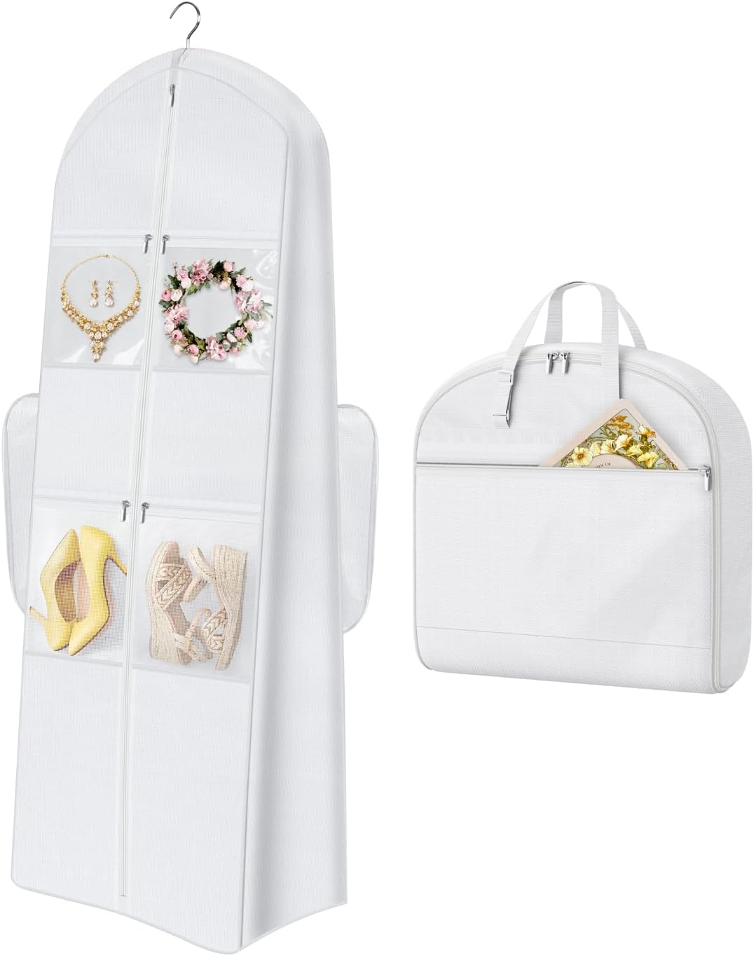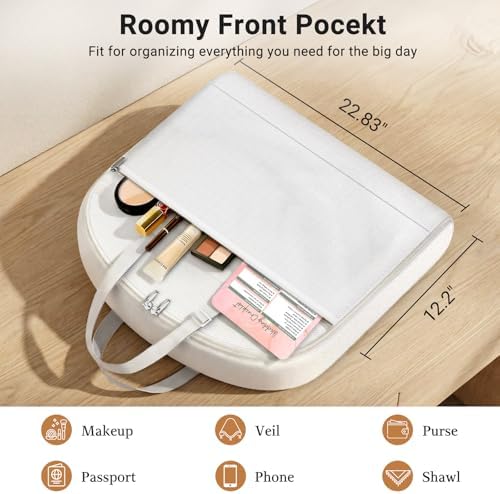- 【Storage All Essentials】 The large external pocket keeps wedding check list within reach. Use the 2 clear PVC pockets for your veil, jewelry, and makeup for easy visibility. Securely store shoes in 2 ventilated mesh pockets to prevent odors. This garment bags for dresses stays everything organized from travel to dressing room