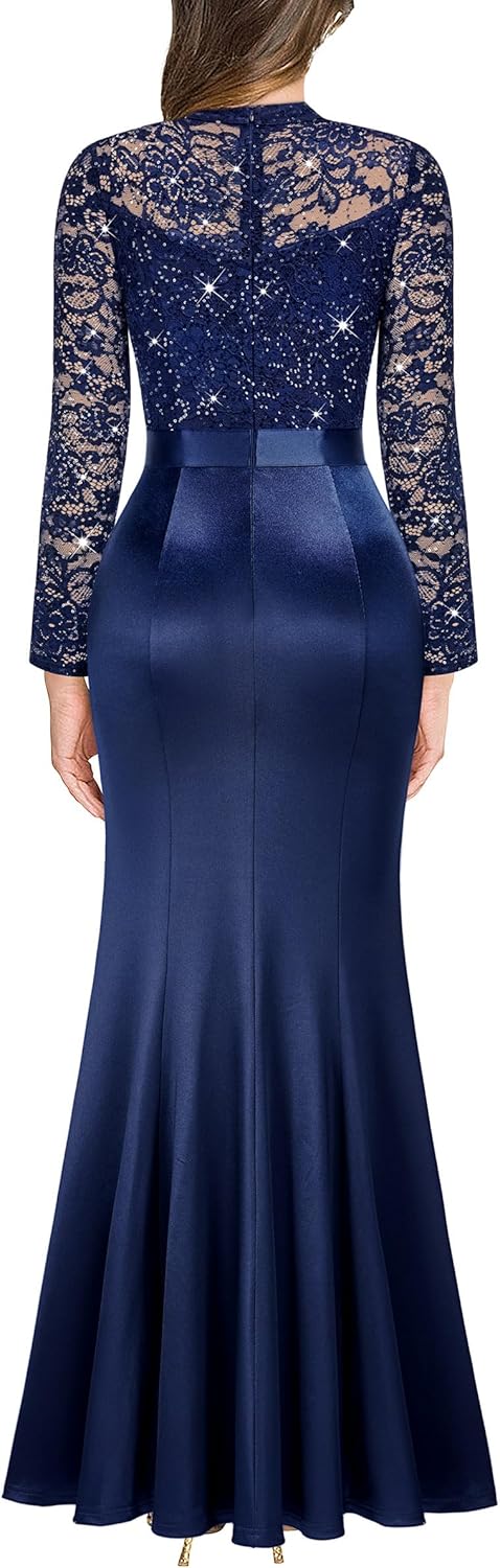 Miusol Womens Vintage Lace Contrast Satin Design Ruched Ruffle Formal Evening Maxi Dress