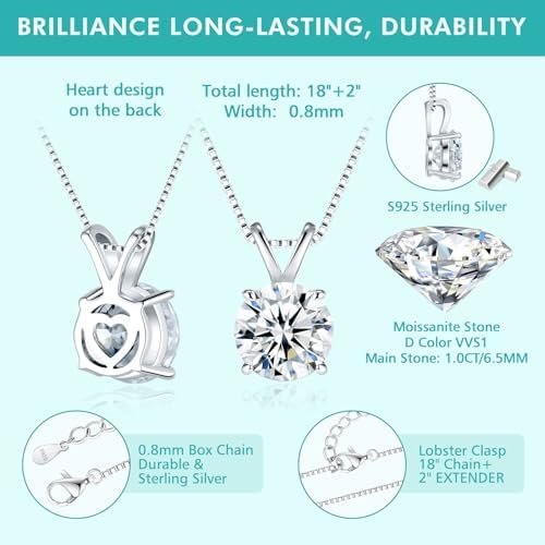 Moissanite Solitaire Necklace for Women, 13 Carat Lab Created Diamond Pendant, D Color VVS1,Heart Back, 18+2 Silver Chain, Gift for Wife, Girlfriend, Mom Yourself on Anniversary, Birthday, Wedding