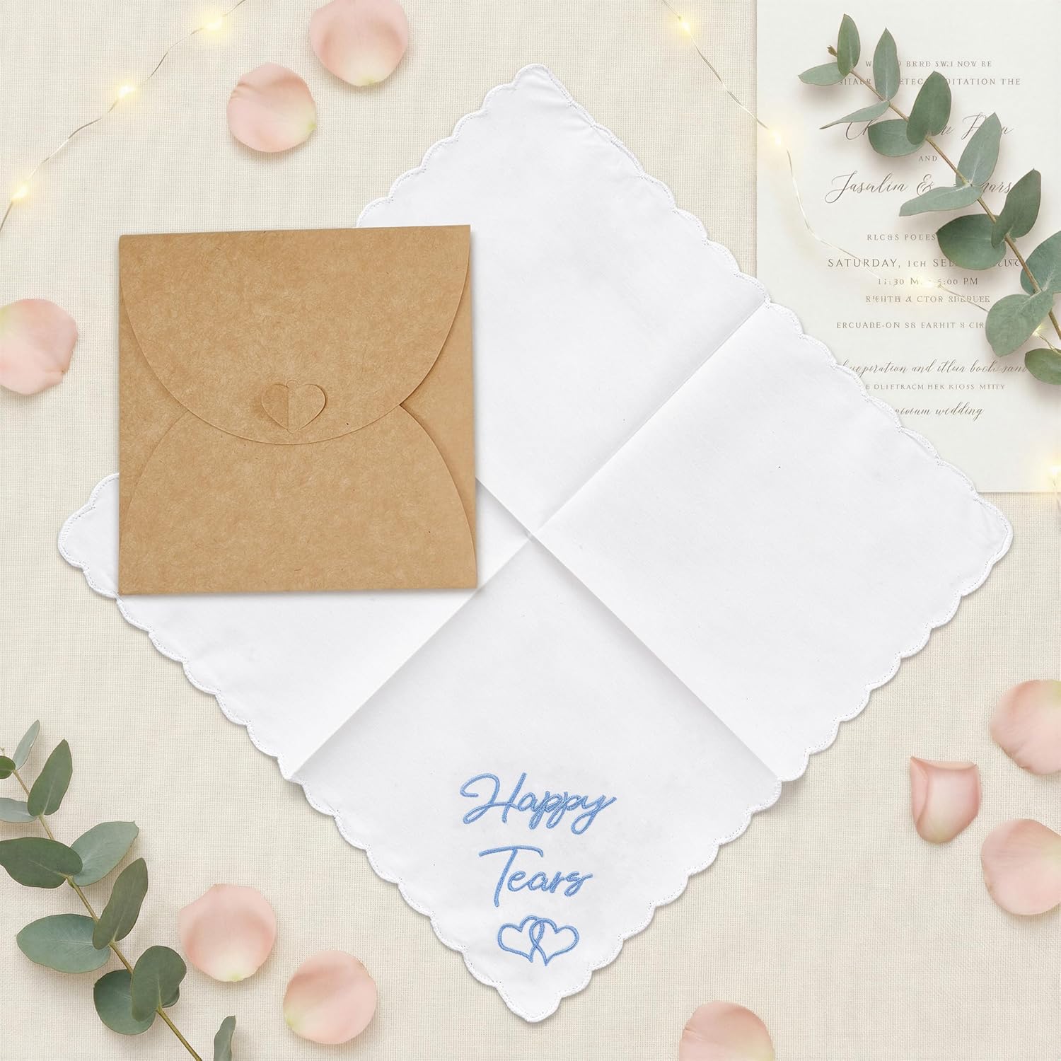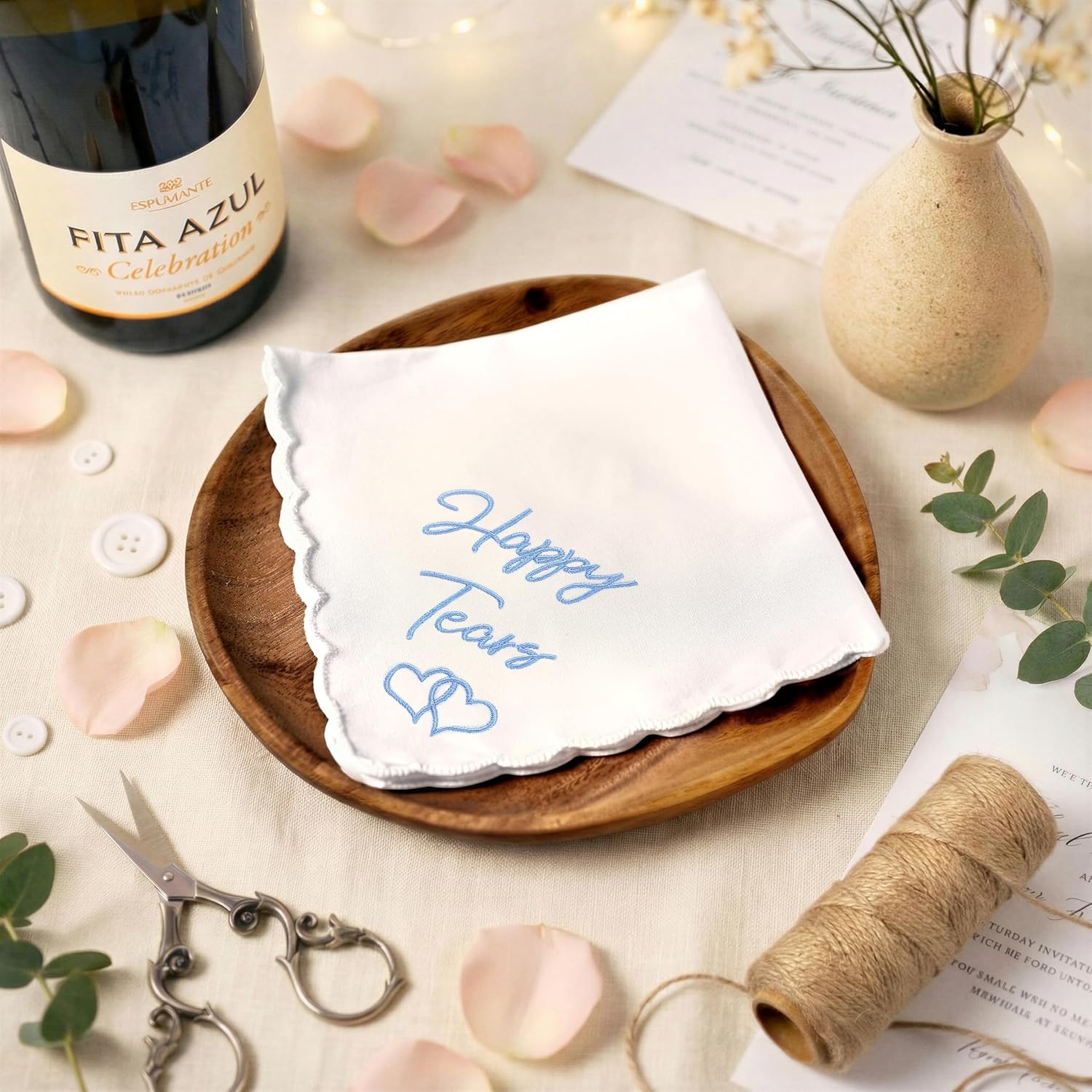 - UNIQUE SENTIMENTAL KEEPSAKE MOMENT – The blue hanky embroidered Happy Tears for women & men is 12×12” white cotton with little scallop lace edges with vintage feel