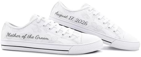 Make your special role as Mother of the Groom even more memorable with these elegant white canvas sneakers. These customizable lace-up shoes feature a delicate floral pattern and can be personalized with the wedding date, creating a unique and comfortable..