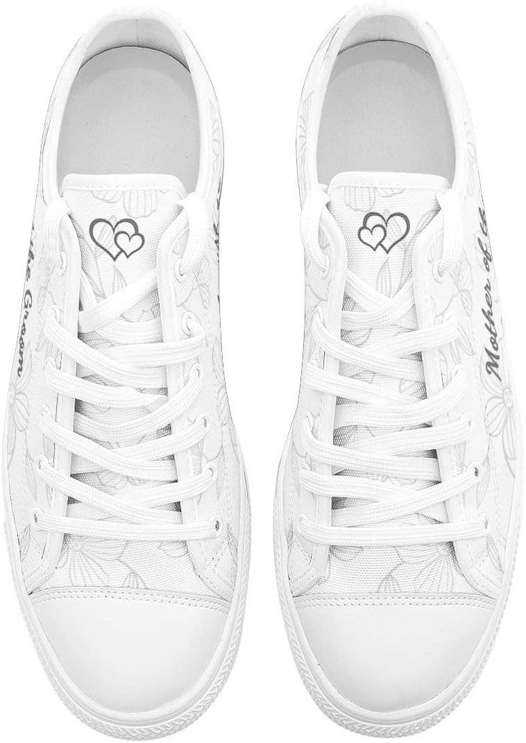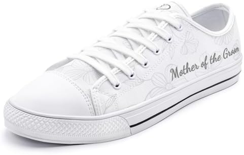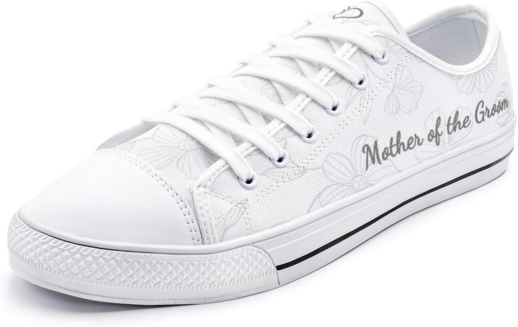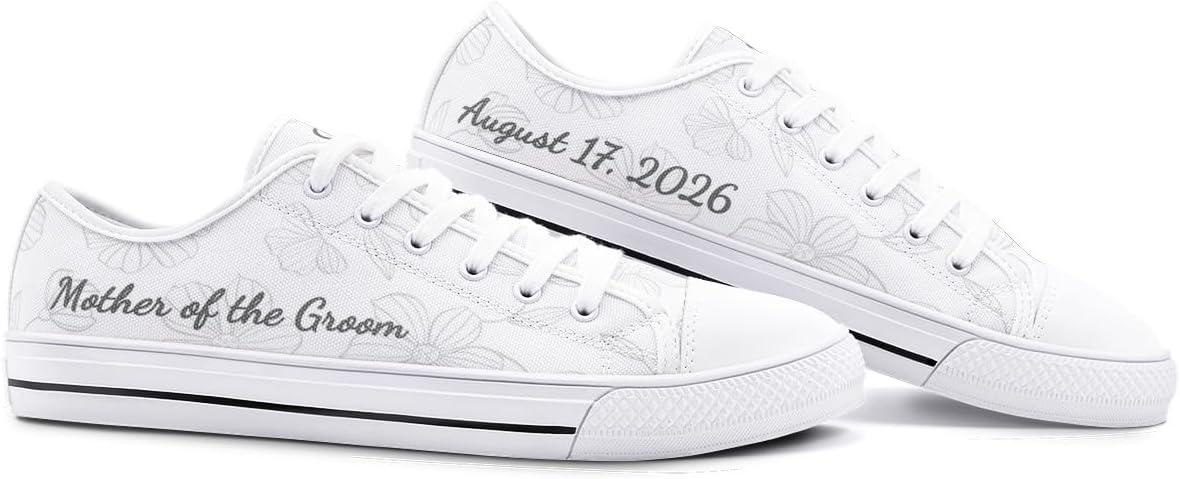 Make your special role as Mother of the Groom even more memorable with these elegant white canvas sneakers. These customizable lace-up shoes feature a delicate floral pattern and can be personalized with the wedding date, creating a unique and comfortable footwear option for all the wedding festivities. The classic low-top design combines style with comfort, featuring a durable canvas upper, traditional lacing system, and a sturdy rubber sole. Perfect for dancing at the reception or getting ready on the big day, these sneakers offer both sentimental value and practical wear. The sophisticated white color scheme complements any outfit while the personalized text adds a touching personal element. The shoes include quality stitching, reinforced eyelets, and a cushioned insole for lasting comfort throughout the celebration. These special occasion sneakers make for a treasured keepsake long after the wedding day has passed.