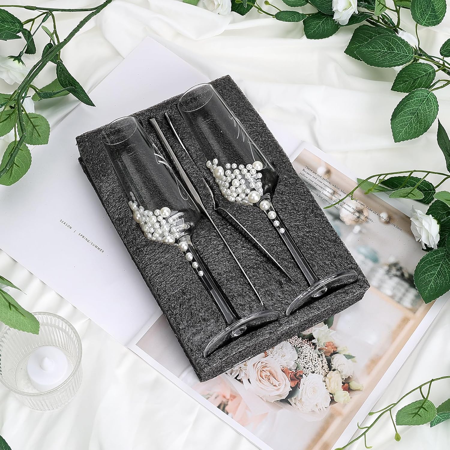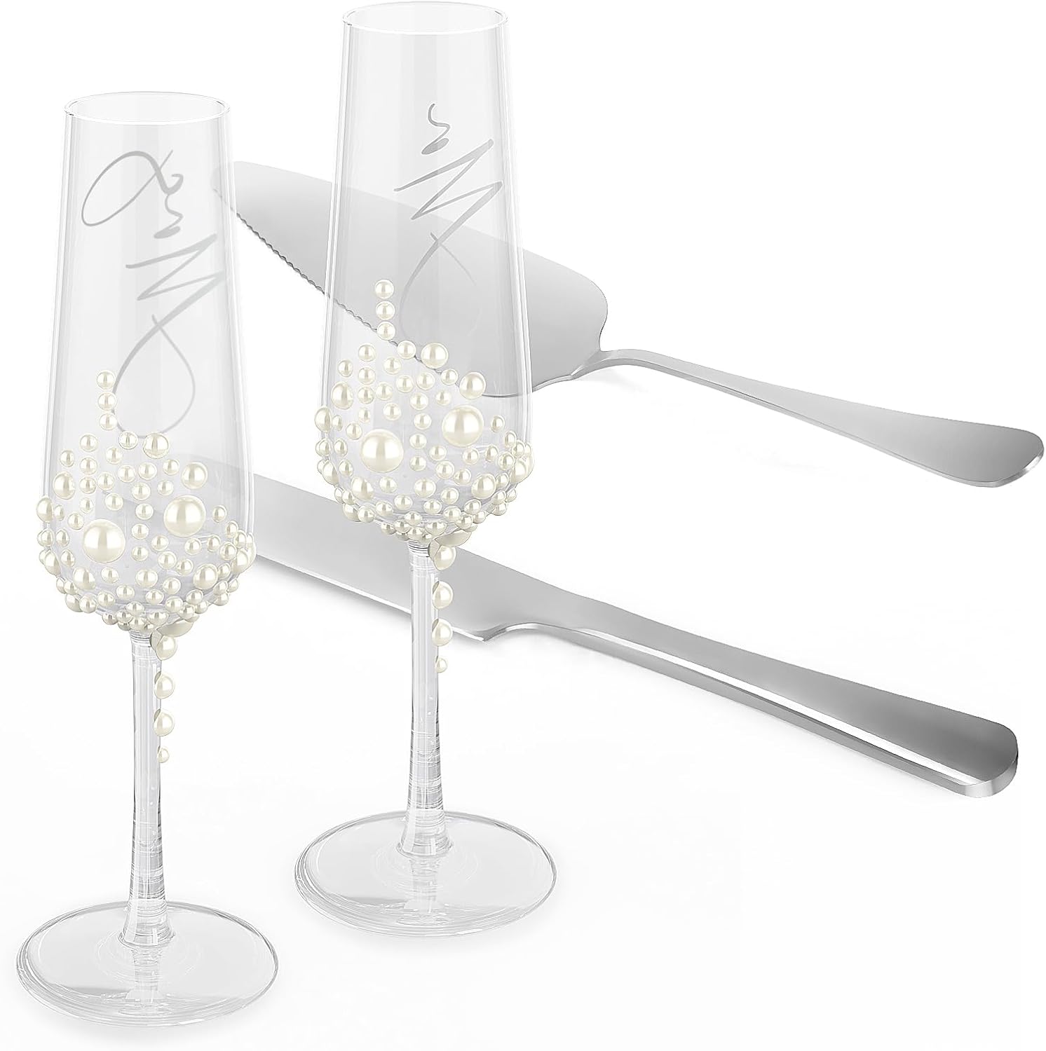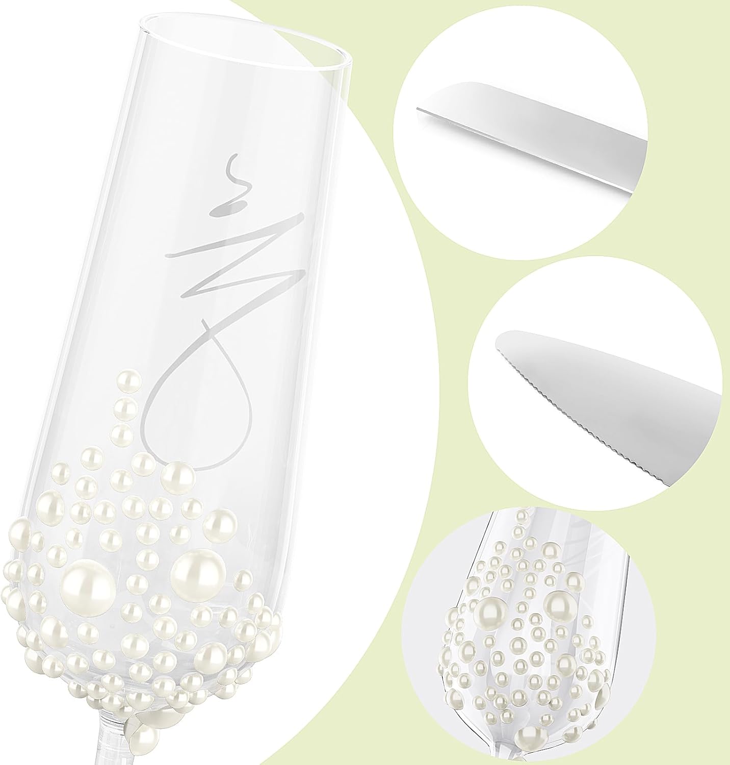 - This wedding flutes and cake server set includes 2 elegant champagne flutes with pearl decor, 1 stainless steel cake knife and 1 matching pie server, ideal for the bride and groom to toast and cut the cake in style.