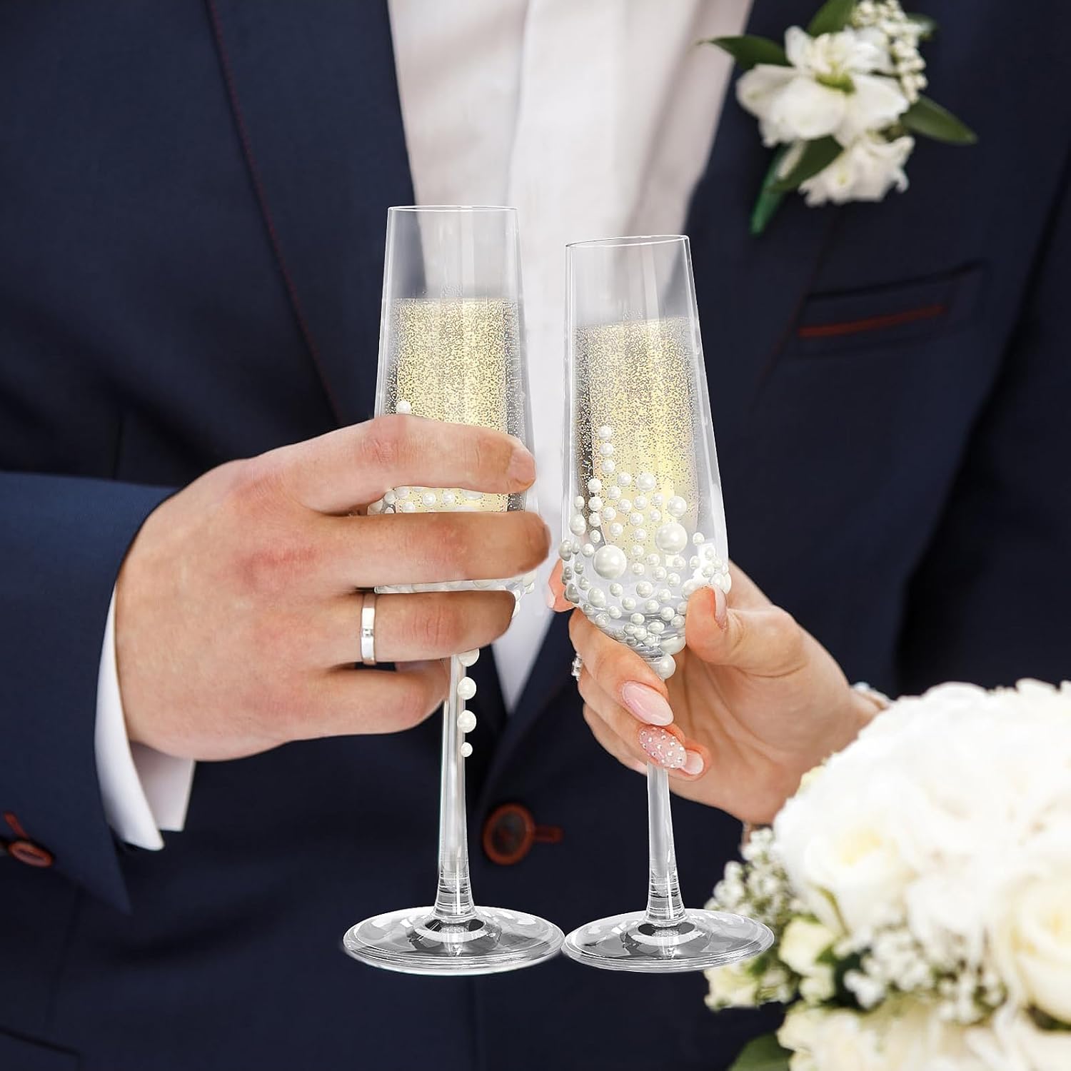 - The toasting glasses feature pearls and engrave with “Mr” and “Mrs” letters, a romantic keepsake for weddings, showers, brunches, cocktail events, anniversaries, and engagements.
